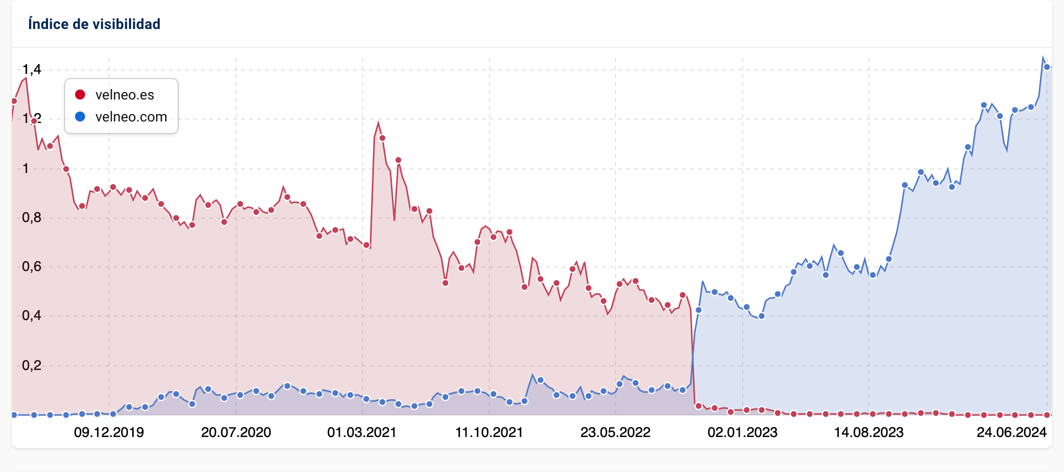 La transición de velneo.es a velneo.com, supervisada con SISTRIX, se convirtió en un caso de éxito que demuestra cómo una migración de dominio, que a menudo es vista como un proceso complejo para el SEO, puede ser ejecutada con éxito.