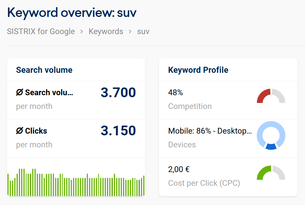 Tras un proceso cuidadoso de colaboración y optimización, llegaron por fin los primeros resultados: el cliente consiguió posicionarse en la primera página de Google para la keyword “SUV” (3.700 búsquedas mensuales) y para otras de la misma área semántica, gracias a los nuevos contenidos optimizados.