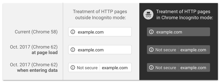Aquí podemos ver cómo Google Chrome tratará los dominios no encriptados: