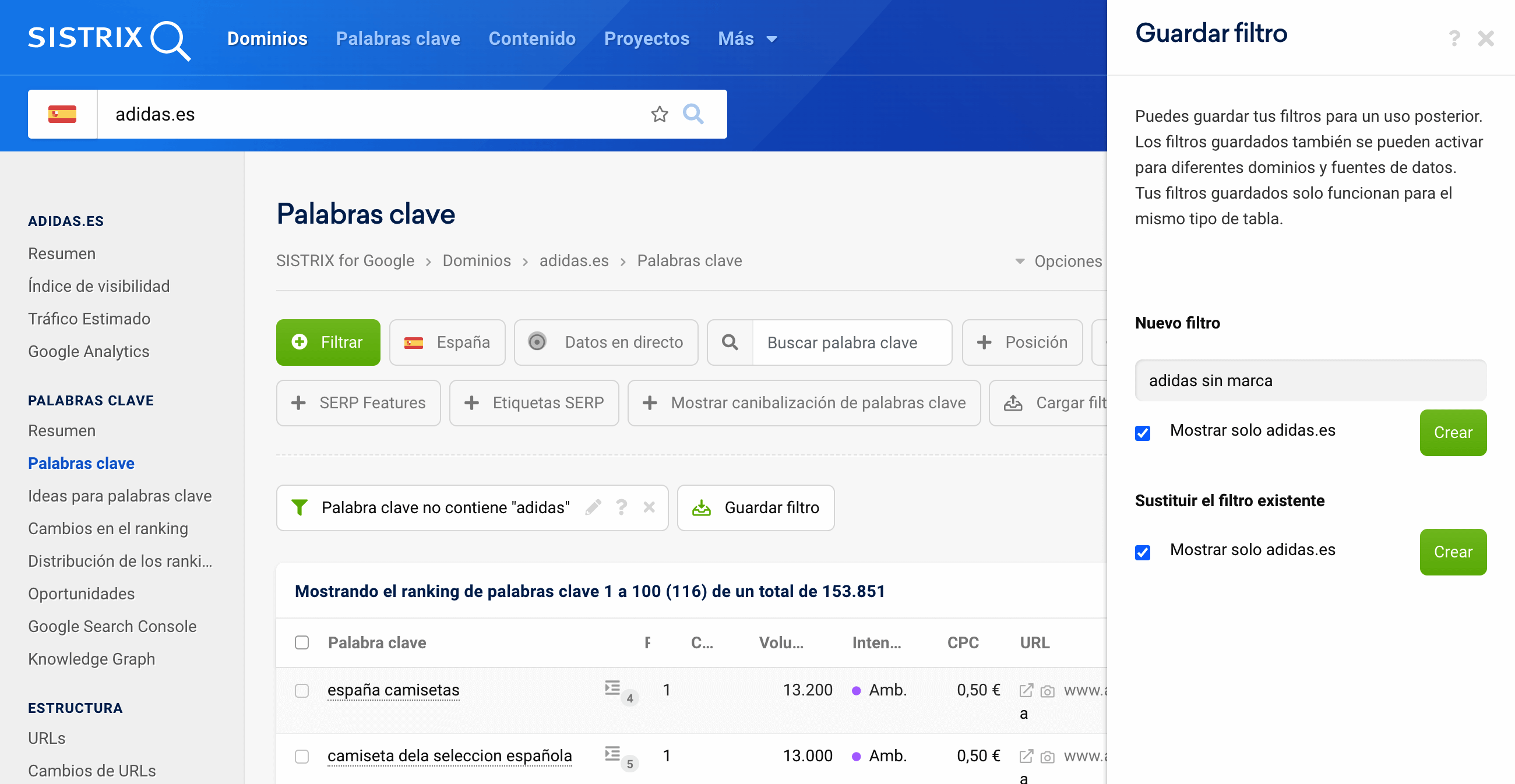 En nuestro ejemplo, filtramos las palabras clave de «adidas.es» que no contienen el nombre de la marca para ver cuánta visibilidad queda de los 16,4 puntos reales. Para ello, establecemos el filtro «Palabra clave que no contiene ‘adidas'» 1 y lo guardamos como nuevo filtro 2.