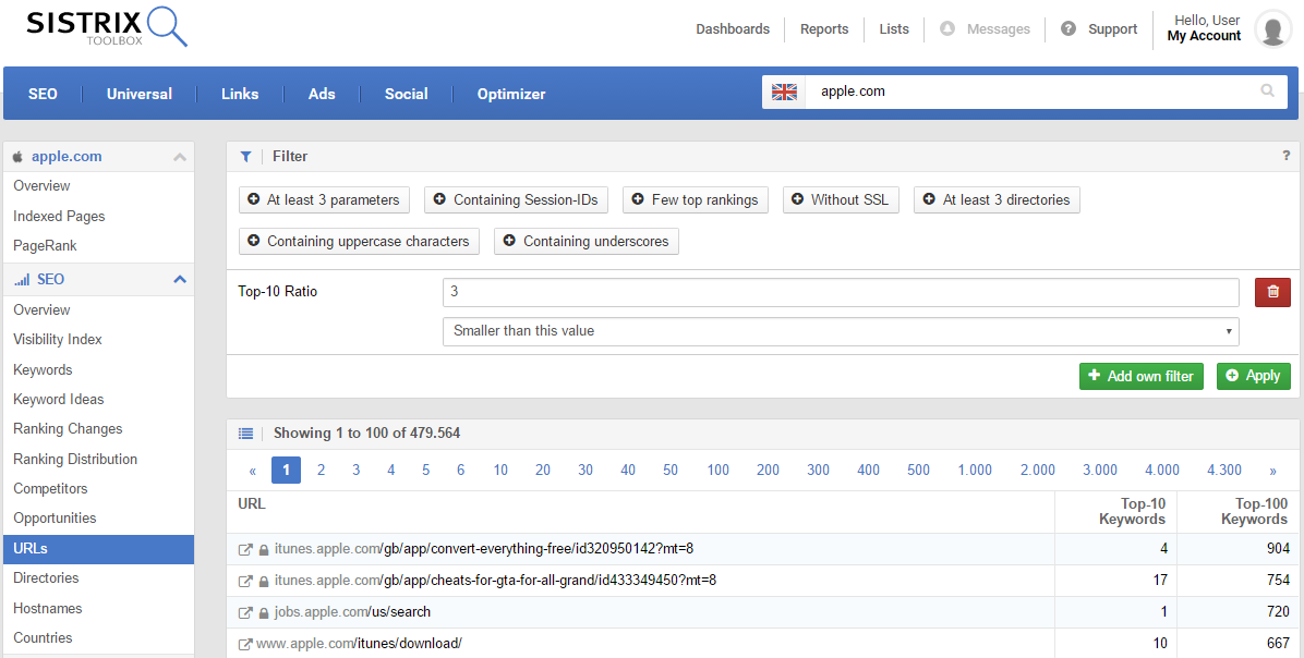 Para un inicio rápido hemos establecido ya algunos filtros que pueden activarse con un solo click. Con el filtro de «Pocos Rankings en el Top 10» – con éste, filtramos las URLs que tienen posicionamientos en el top 100 pero que a penas posicionan en el top 10. Candidatas ideales para analizar, sobretodo si queremos tenerlas en el índice de Google.
