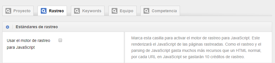 La interpretación de JavaScript es mucho más intensa que la interpretación de HTML y gasta más recursos. Por ese motivo el rastreador usará 10 créditos por cada documento HTML (para el parsing de un documento HTML normal, se usa 1 crédito). Pero como tienes 500.000 créditos de reastreo disponibles, no creemos que tengas problemas para incluso rastrear grandes proyectos que contengan mucho JavaScript.