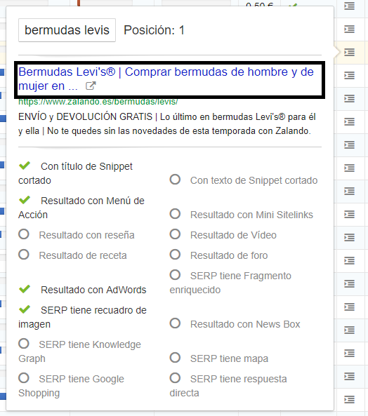 Si vas con el puntero de tu ratón al símbolo de “vista previa”, podrás ver el resultado de búsqueda tal cual sale en Google y que además tiene el título cortado: