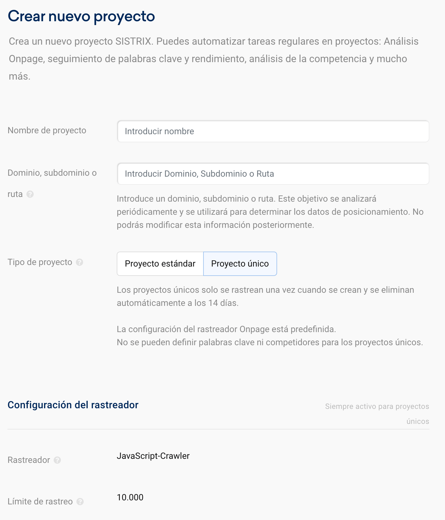 Solo se puede realizar una única evaluación Onpage por proyecto, es decir, no es posible reiniciar el rastreo en este tipo de proyectos. Cada rastreo se guardará durante 14 días y el límite de proyectos/día depende del paquete que tengas contratado.