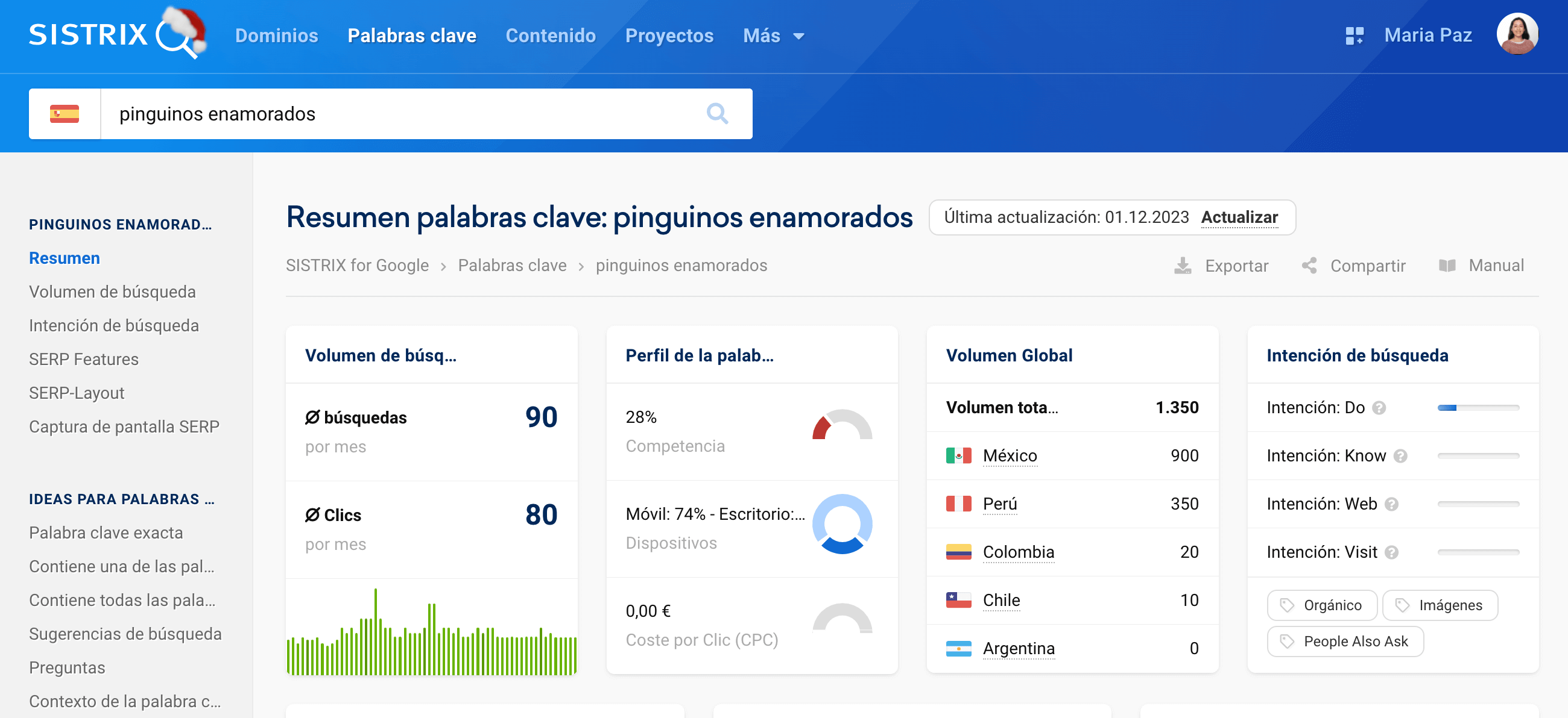 Puedes iniciar una actualización manual haciendo clic en el botón situado en la parte superior junto al nombre de la palabra clave. (Ten en cuenta el número de actualizaciones SERPs disponibles en tu paquete SISTRIX).