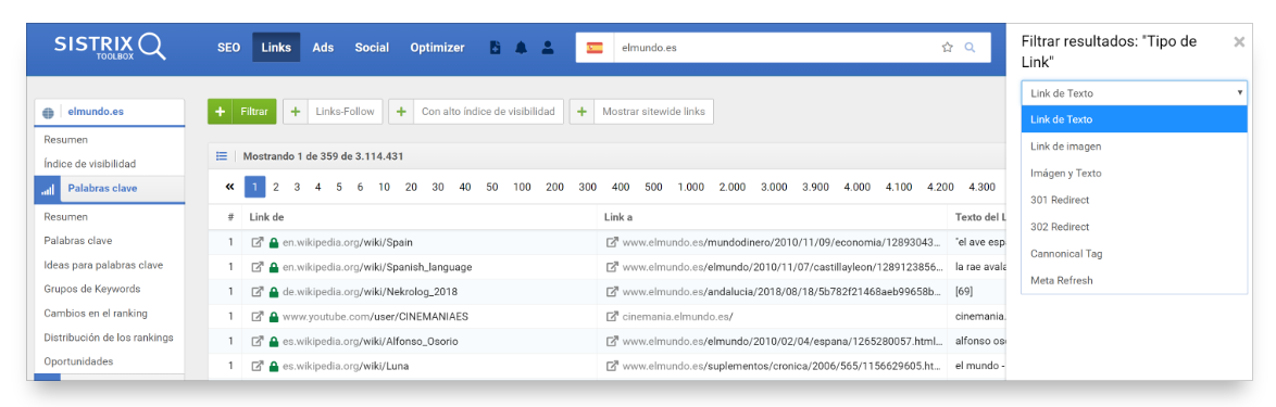 Dentro del apartado «Enlaces» encontrarás varios filtros para ordenar los resultados. Solo has de hacer clic en el botón «Filtrar». Al hacer clic se abrirá un menú a la derecha, donde escogeremos el filtro «Tipo de enlace», y ahí podremos elegir entre los distintos tipos de enlaces. Selecciona el filtro deseado y visualizarás los resultados.