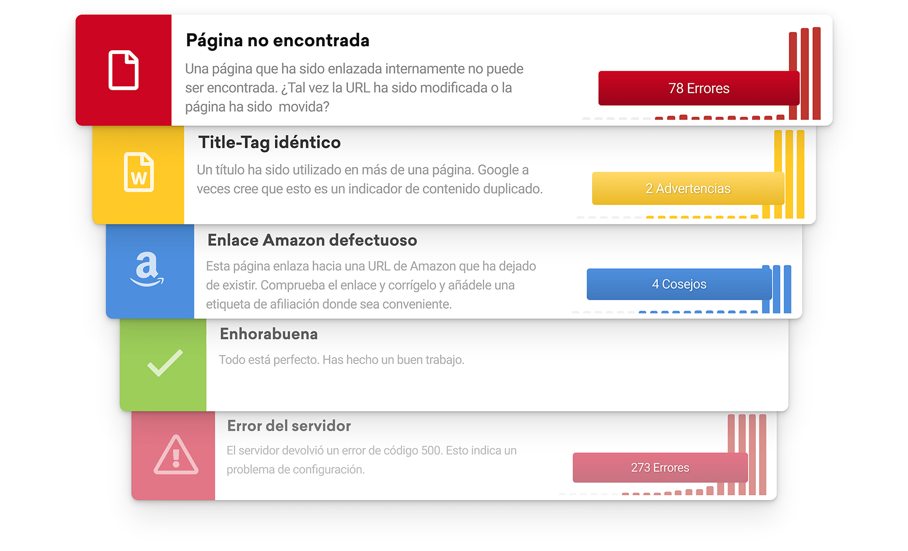 Las deficiencias técnicas de un sitio web pueden causar pérdidas de posicionamiento. El Proyecto Onpage SISTRIX reconoce las debilidades en la optimización de la página y proporciona sugerencias para solucionar problemas. Todas las sugerencias están ordenadas por relevancia para acelerar tus resultados.