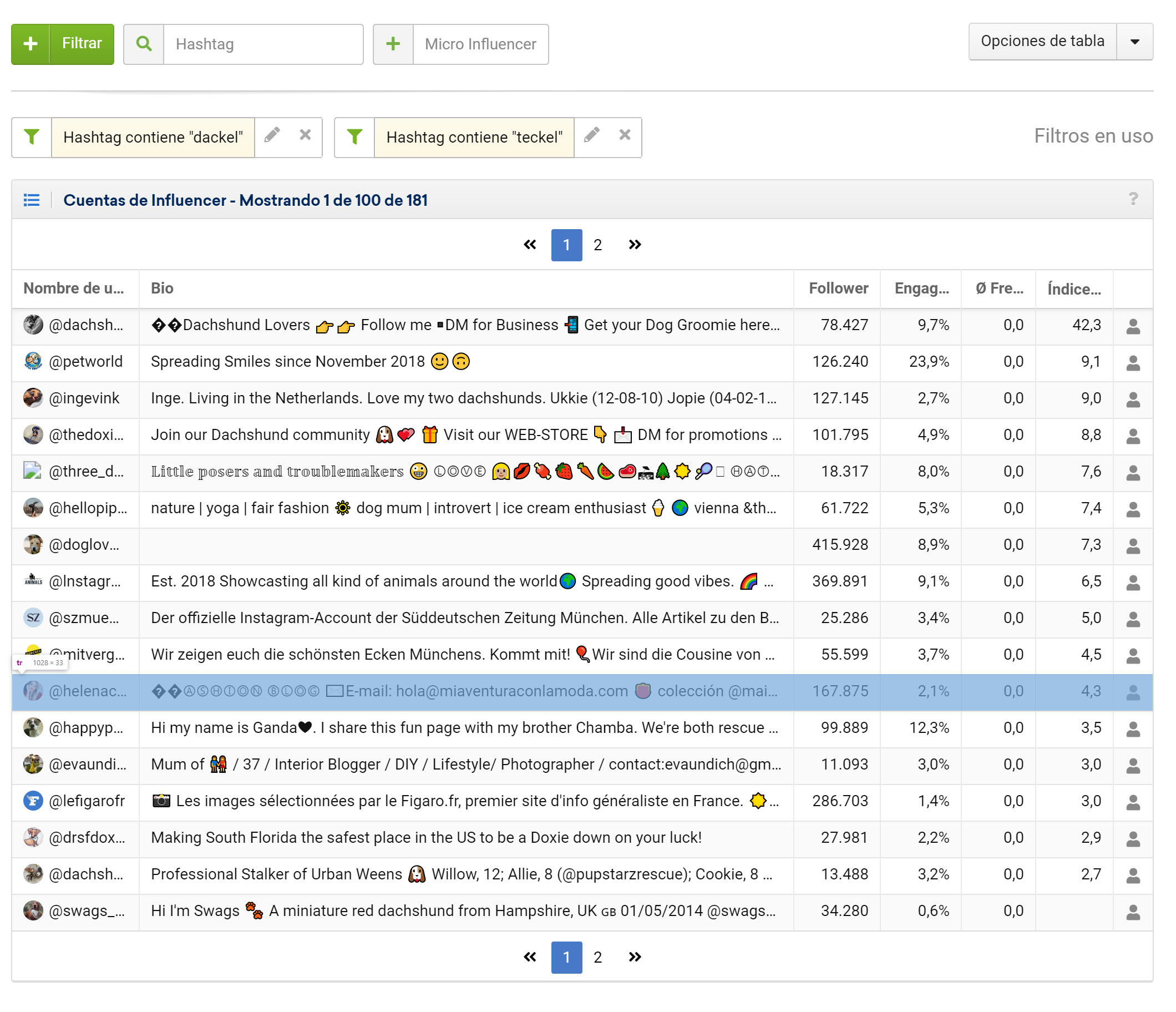 Para la función de búsqueda, combinamos la información de la cuenta (como el número de seguidores) con las actividades de publicación de los últimos 3 meses. Si hipotéticamente tú te interesaras por cuentas de Instagram que tratan sobre la raza de perro Teckel, la búsqueda de los hashtags «#dackel» y «#teckel» te proporcionará una buena selección: