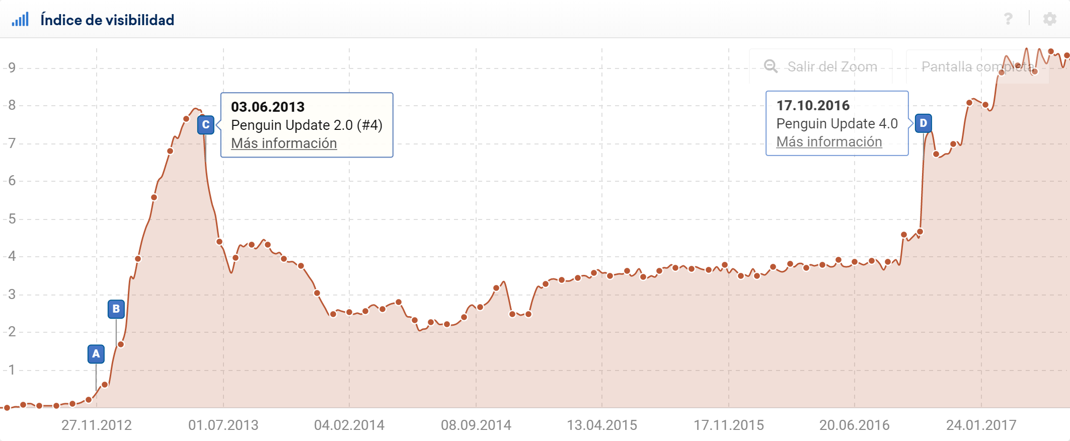Utilizando el Índice de Visiblidad SISTRIX no solo podrás medir el éxito de las medidas SEO, también analizar las consecuencias de las Actualizaciones de Algoritmo de Google y elmanual de penalizaciones.