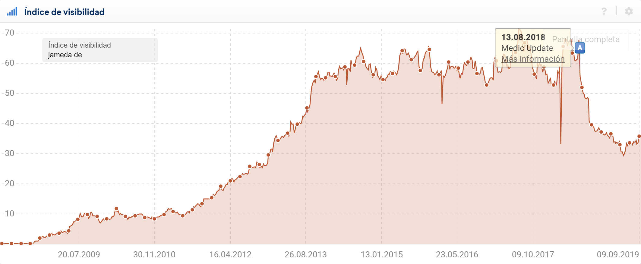 El siguiente ejemplo muestra la pérdida de visibilidad de jameda.de durante la Medic Update a finales de 2018: