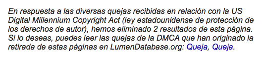 Si un sitio Web ha sido elimininado de la lista de resultados por una queja del US Digital Millenium Copyright Act, aparecerá siempre la siguiente advertencia en la página de resultados: