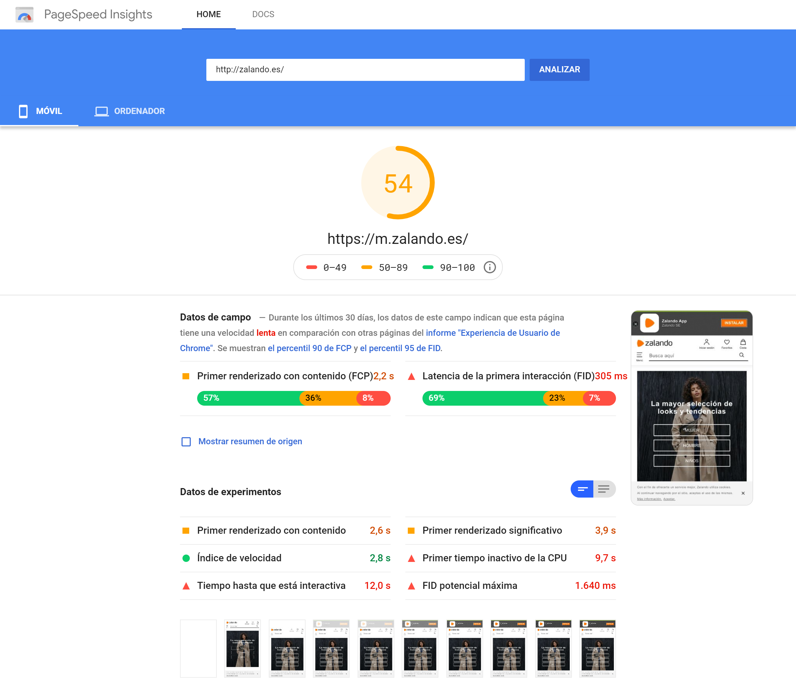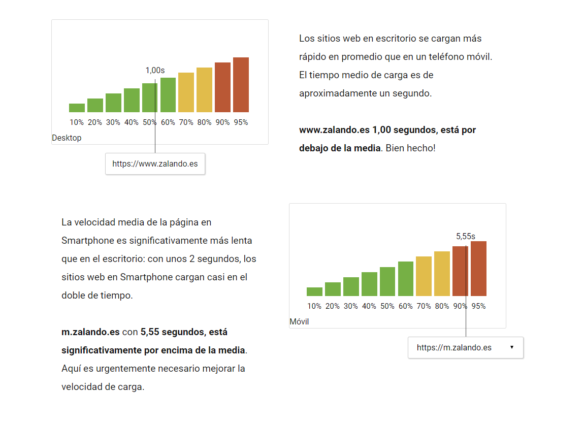 Detalles de PageSpeed con la herramienta de PAgeSpeed de SISTRIX para el dominio zalando.es