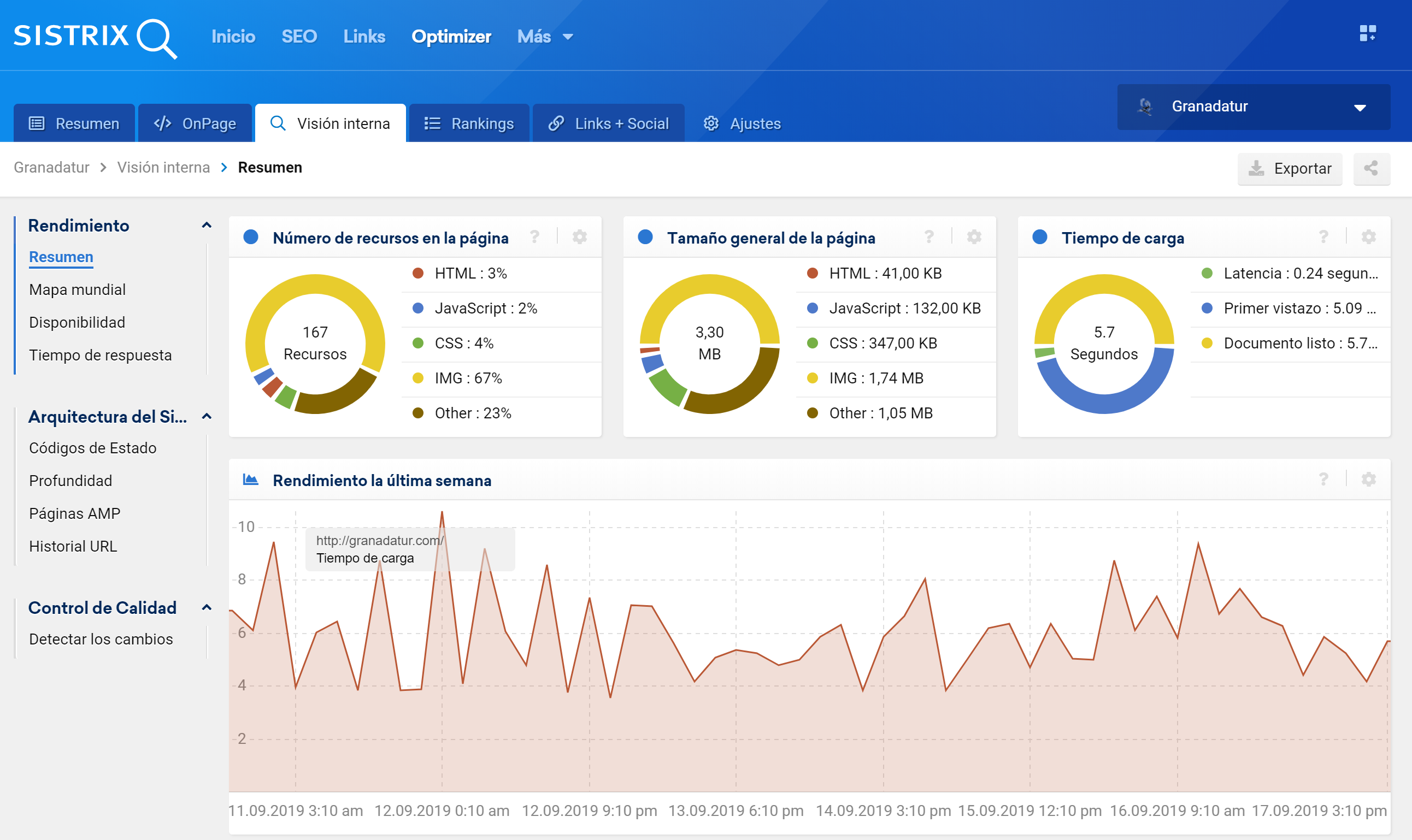 Resumen del rendimiento de un proyecto en el Optimizer SISTRIX donde se puede ver por ejemplo los recursos o el tiempo de carga del dominio examinado