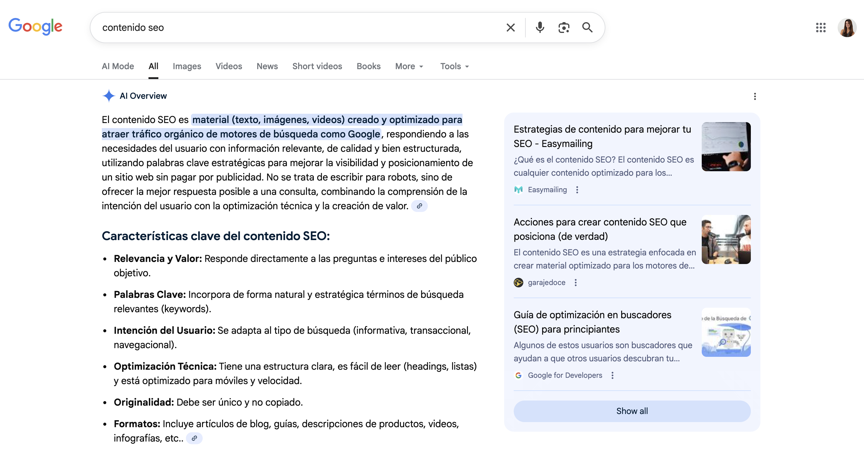 Los AI Overviews son respuestas generativas que Google muestra directamente en la página de resultados, por encima de los resultados orgánicos tradicionales. Estas respuestas se generan mediante inteligencia artificial y se apoyan en una combinación de contenidos web, el Knowledge Graph de Google y otros datos estructurados.