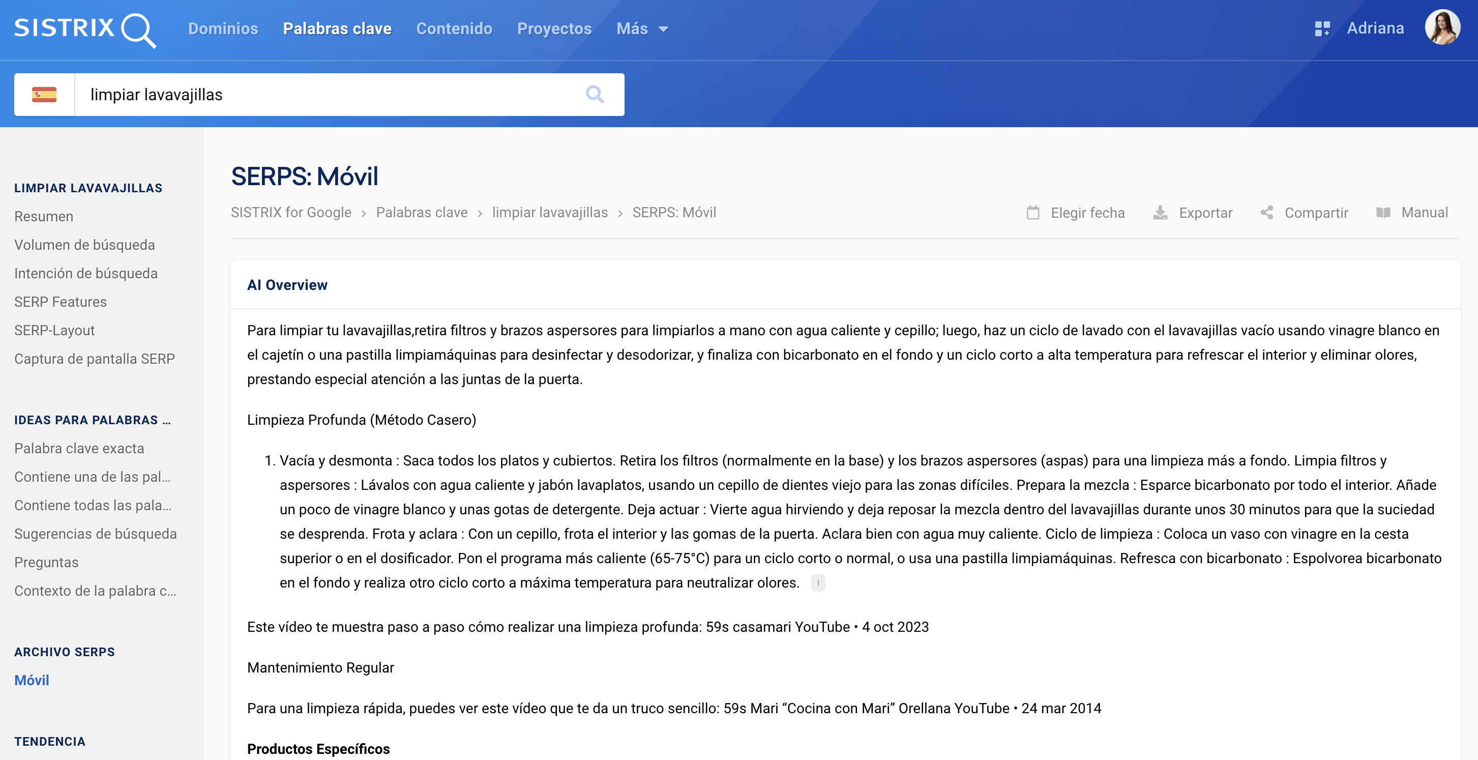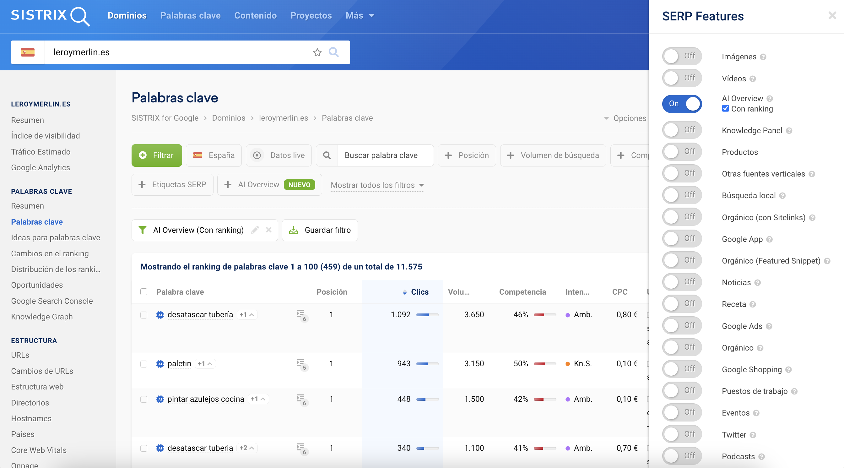 En la tabla de palabras clave, cuando un término activa un AI Overview, se muestra un icono azul de IA. Mediante el filtro de SERP Features se pueden identificar las palabras clave para las que Google muestra un AI Overview. Además, con la opción “Con ranking” es posible comprobar si un dominio aparece citado como fuente dentro del panel de IA.