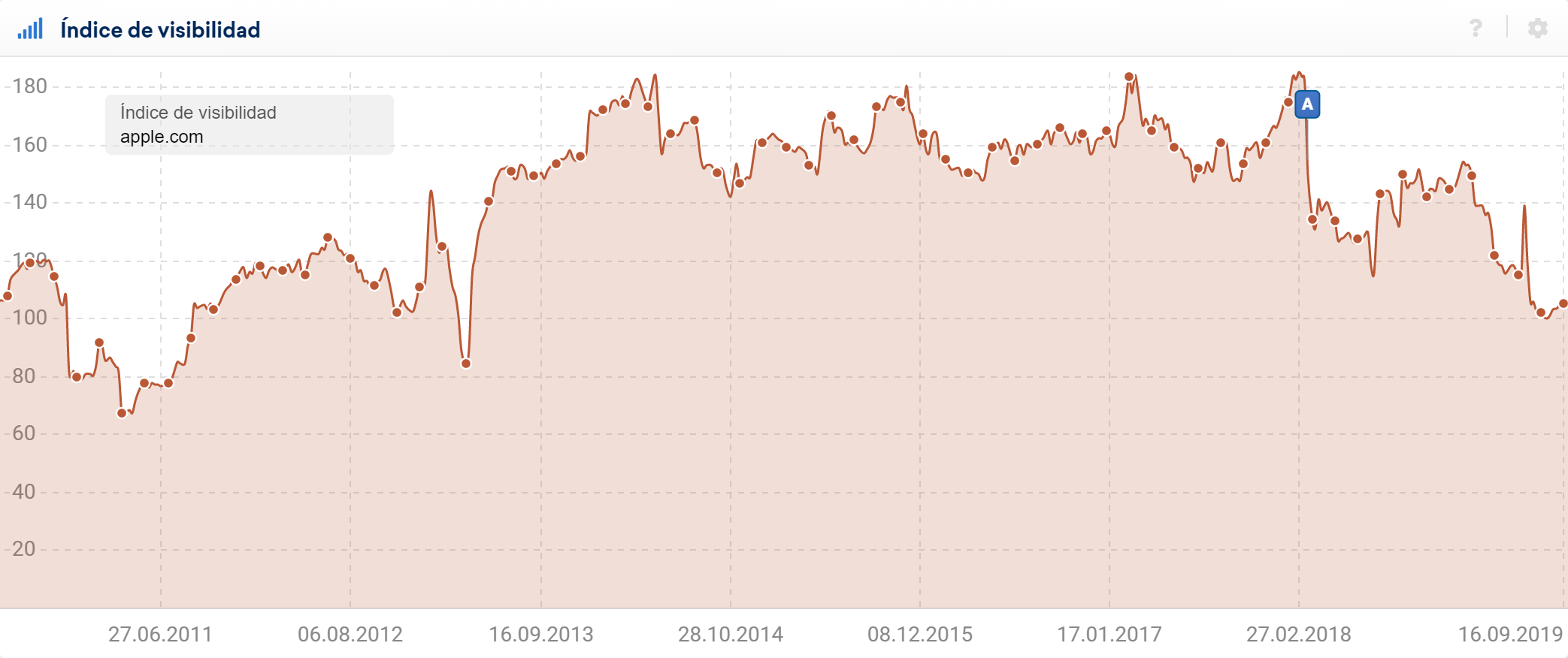Gráfica que muestra el desarrollo del índice de visibilidad para el dominio apple.com en los resultados de búsqueda de Google.es
