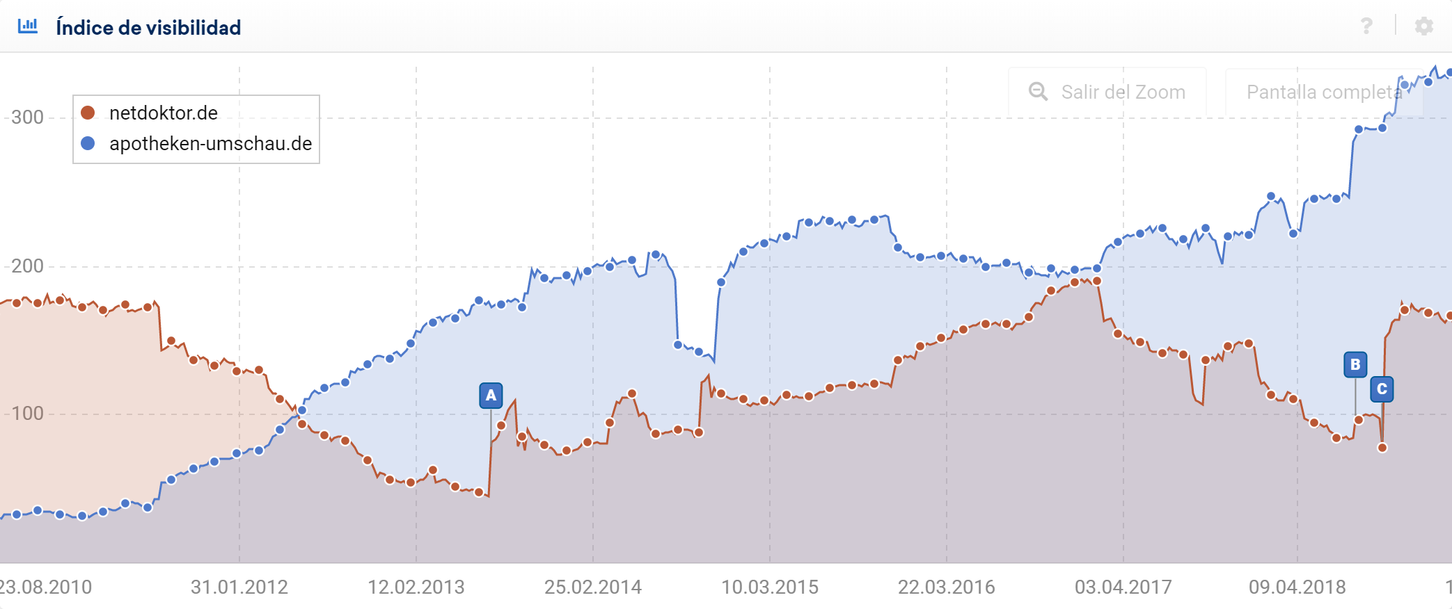 Si se compara el desarrollo de la visibilidad de netdoktor.de con la de Apotheken-Umschau.de, se puede ver un ejemplo impresionante de un cambio de liderazgo del mercado SEO, en este caso con los portales de salud en Alemania.