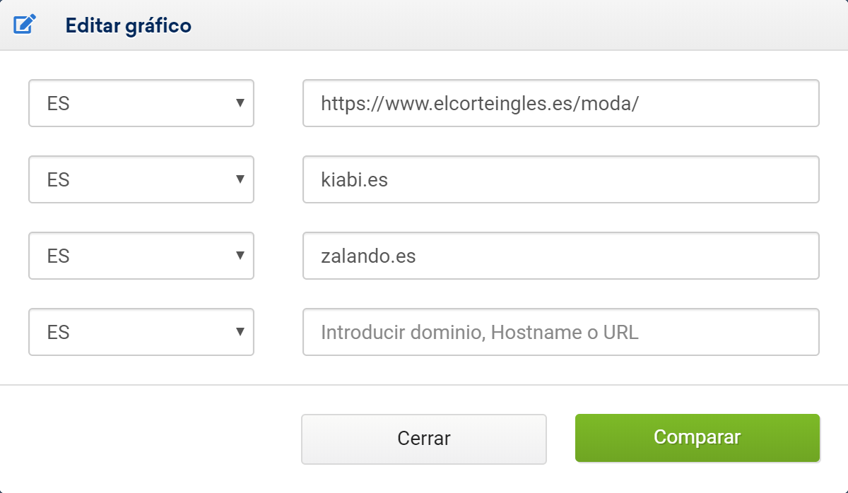 Si lo deseas, también puede comparar directorios individuales o subdominios entre sí. Por ejemplo, podemos comparar el directorio /moda/ de elcorteingles.es con el dominio zalando.es y kiabi.es como principales competidores online.