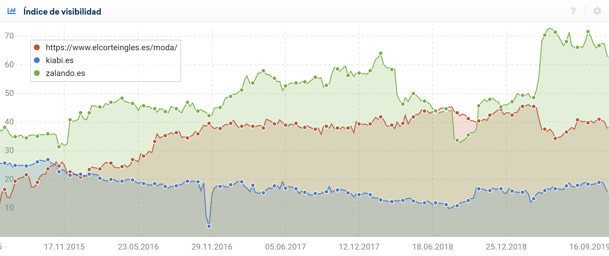Gráfica comparativa del directorio /moda/ de elcorteingles.es con el dominio zalando.es y kiabi.es como principales competidores online.