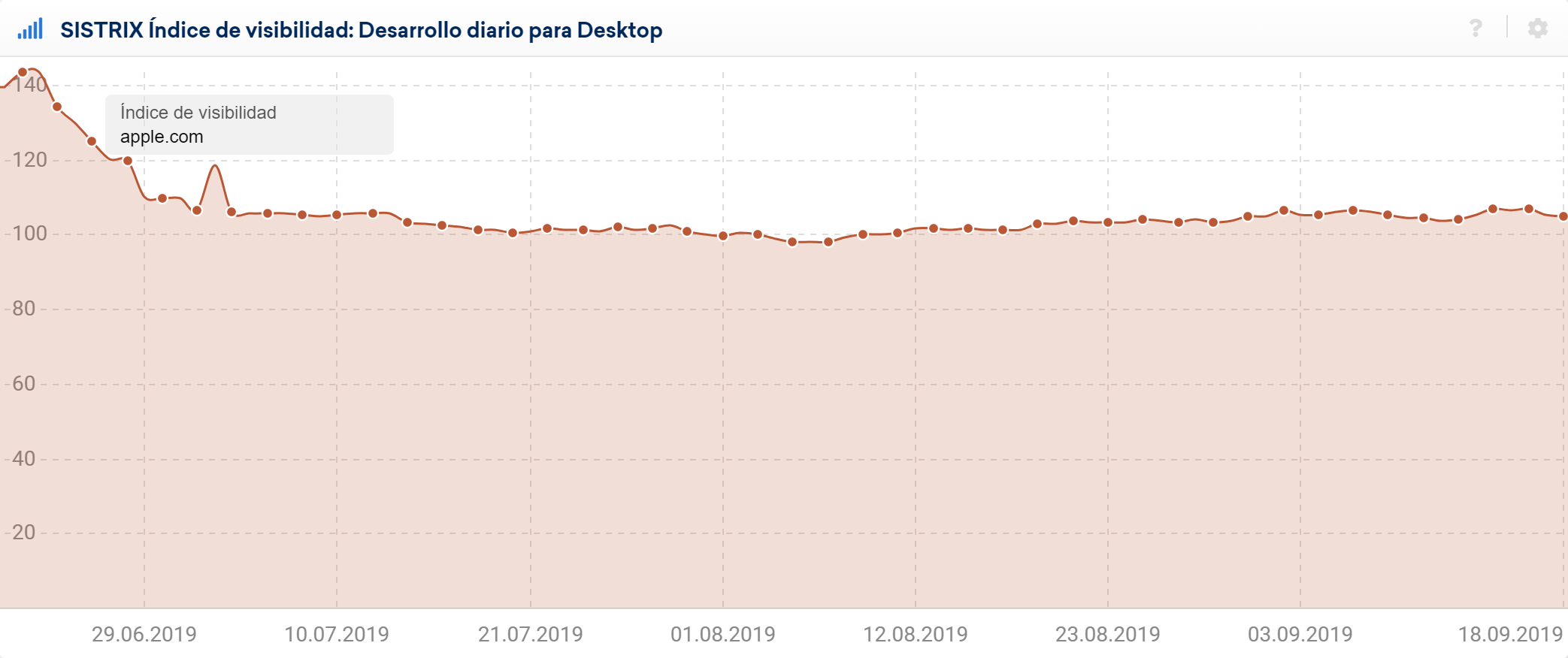índice de visibilidad diario para el dominio apple.com en los resultados de búsqueda de Google.es