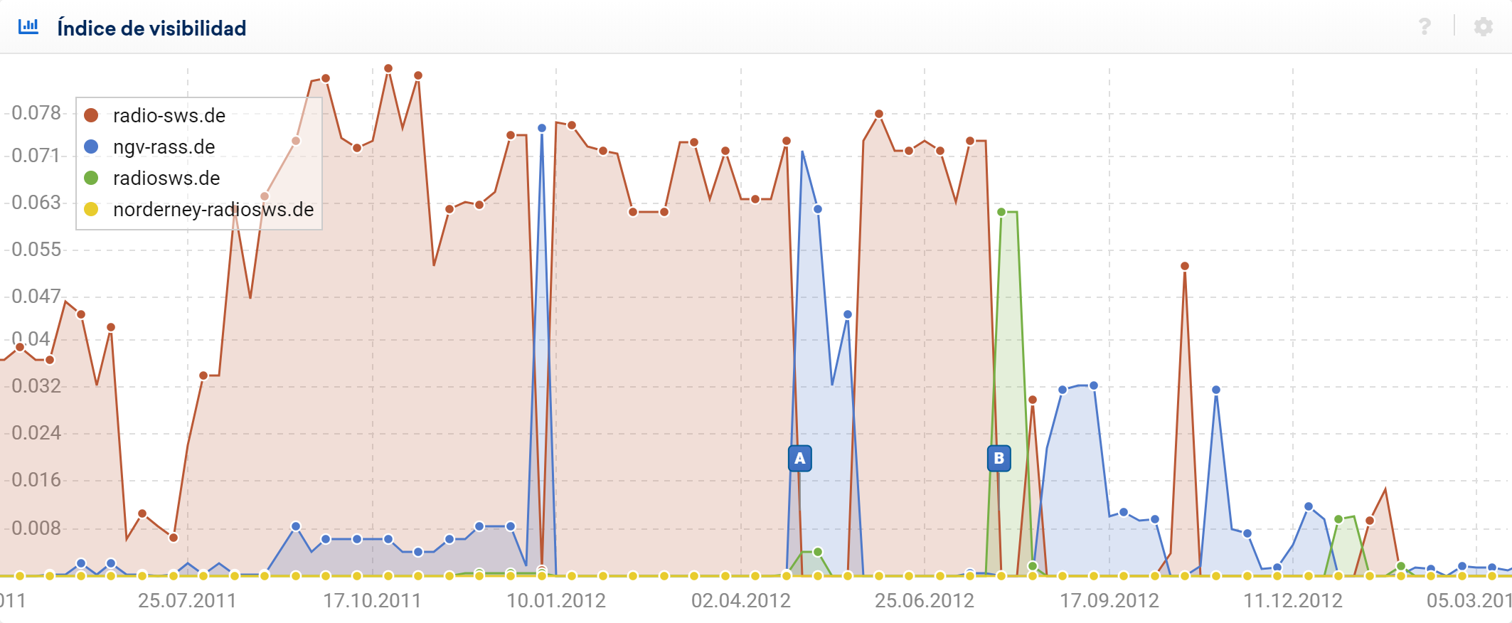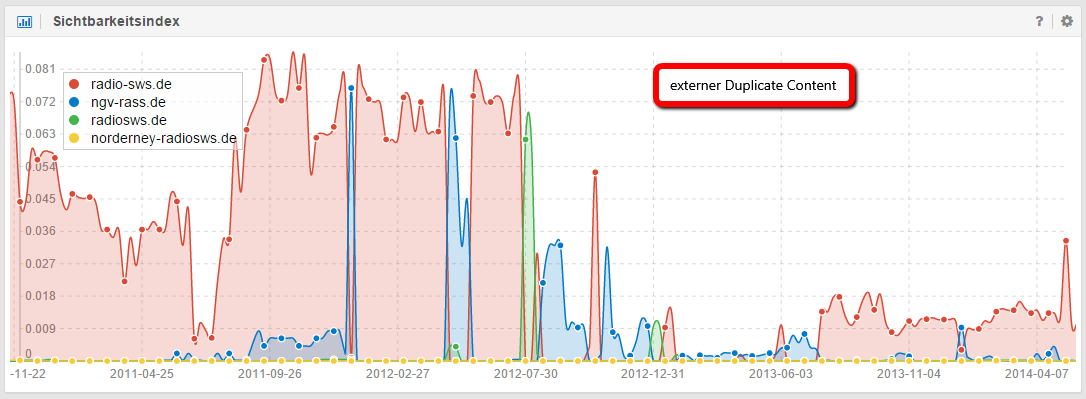 Un curso muy variable del índice de visibilidad debido a dominios adicionales con contenido duplicado también puede afectar a más de dos dominios. Aquí vemos un ejemplo del transmisor de ondas de radio Norderney.