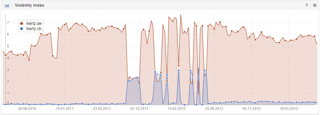 La comparación muestra de manera impresionante que la visibilidad de Hertz.de, representada por la línea roja, siempre disminuye significativamente cuando la visibilidad de Hertz.ch aumenta y viceversa. Aquí se reconoce claramente una interacción directa. Al parecer, es difícil para Google asignar los dos sitios web al país correcto y filtrar uno de los dos dominios en los resultados de búsqueda alemanes alternativamente. Esto da como resultado el patrón de zigzag observado en el índice de visibilidad.