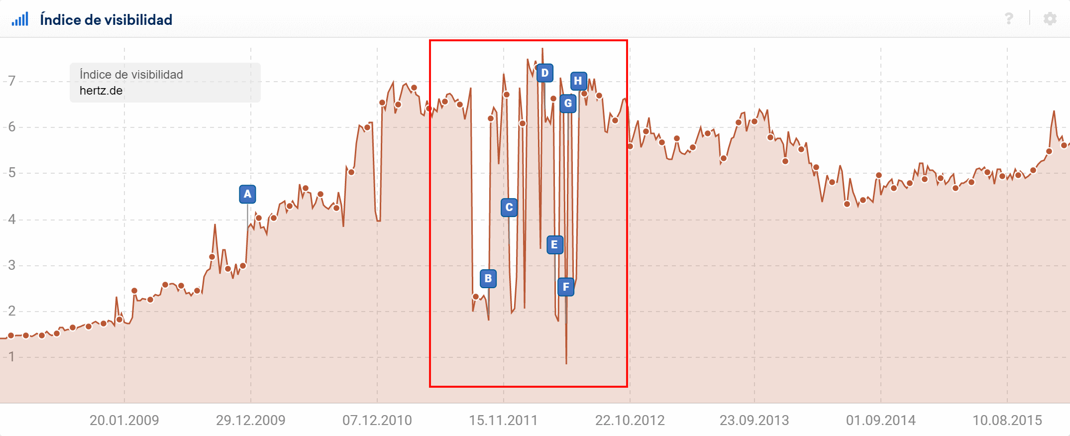 Historial del índice de Visibilidad para el dominio hertz.de con un problema de Contenido Duplicado visible