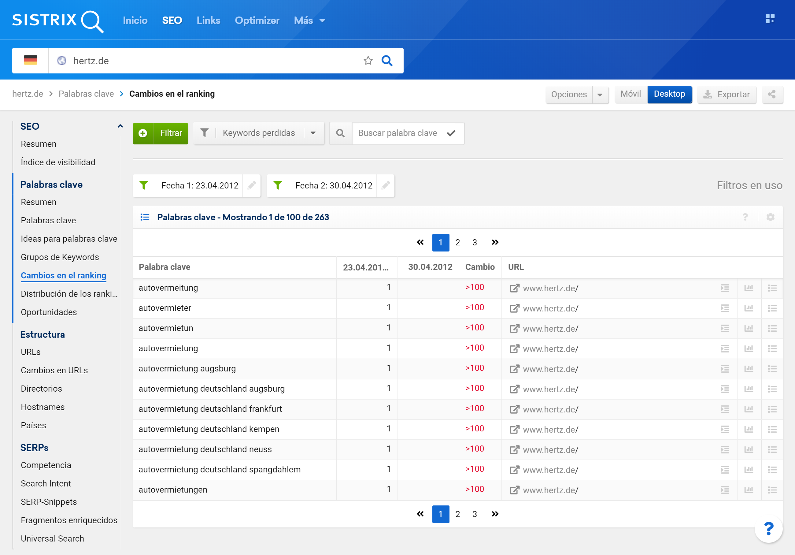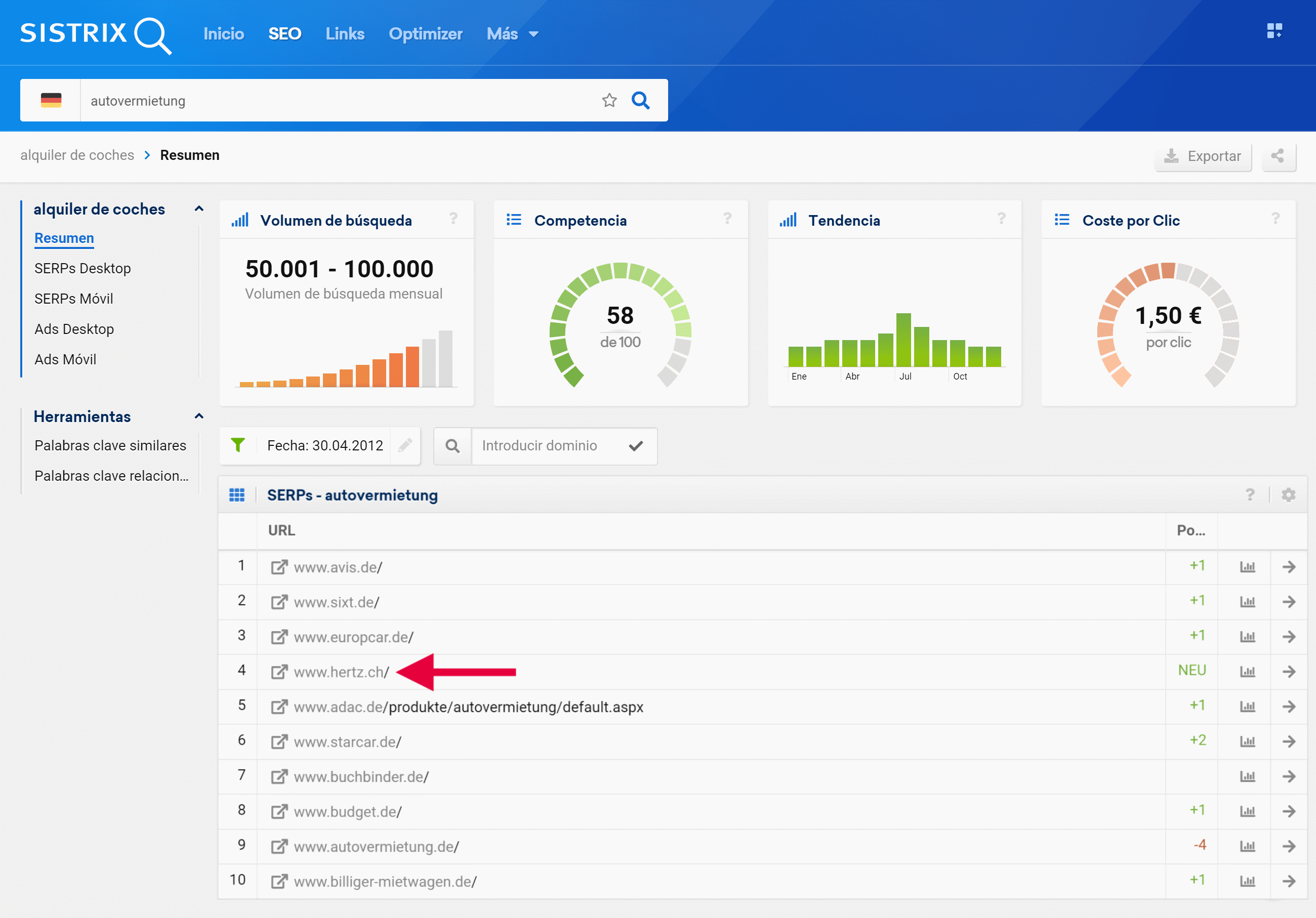 Por lo tanto, a continuación buscamos en el archivo SERP de la herramienta el top 100 de «alquiler de coches» (autovermitung) para la fecha. Solo tiene que introducir la palabra clave «alquiler de coches» (autovermitung) en la esquina superior izquierda de la herramienta y seleccionar la fecha 30.04.2012. Tal vez un duplicado de Hertz.de se ha hecho cargo de la posición perdida.