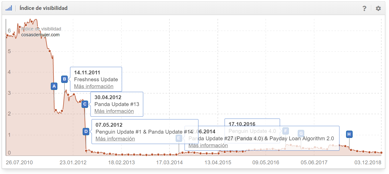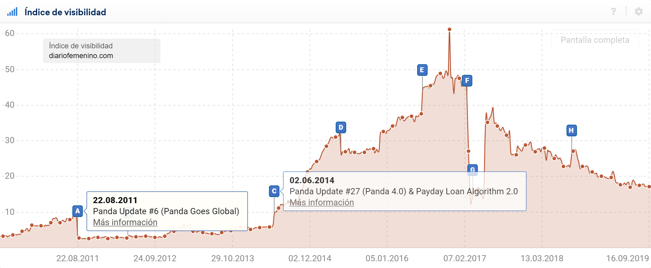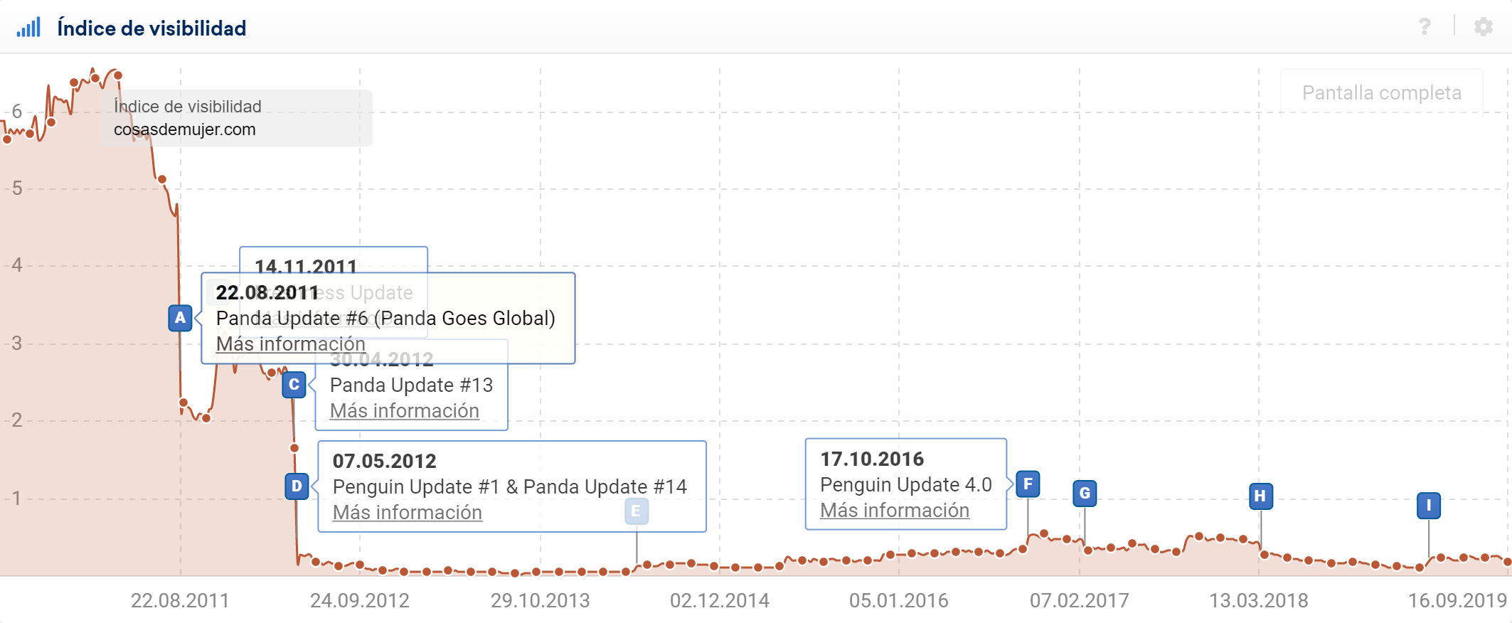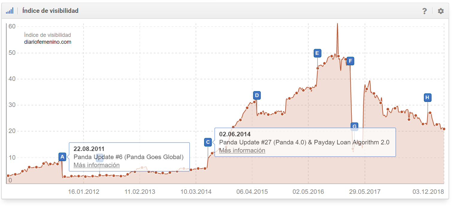 Este dominio, por ejemplo, castigado por el Panda Update fue capaz de deshacerse de la penalización algorítmica después de casi dos años. Durante este período Google realizó varias actualizaciones, pero fue solo con la número 27 que la penalización para este sitio web se levantó automáticamente.