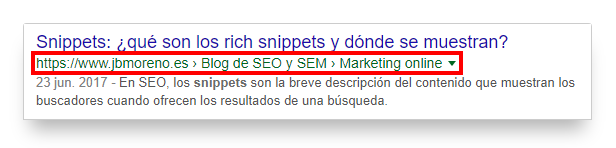 Si se proporcionan migas de pan en forma de datos estructurados, la ruta de navegación correspondiente puede aparecer en el SERP Snippet en lugar de la URL: