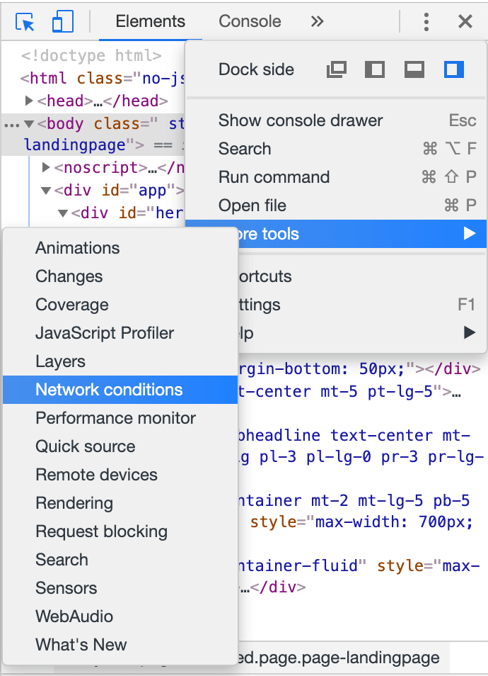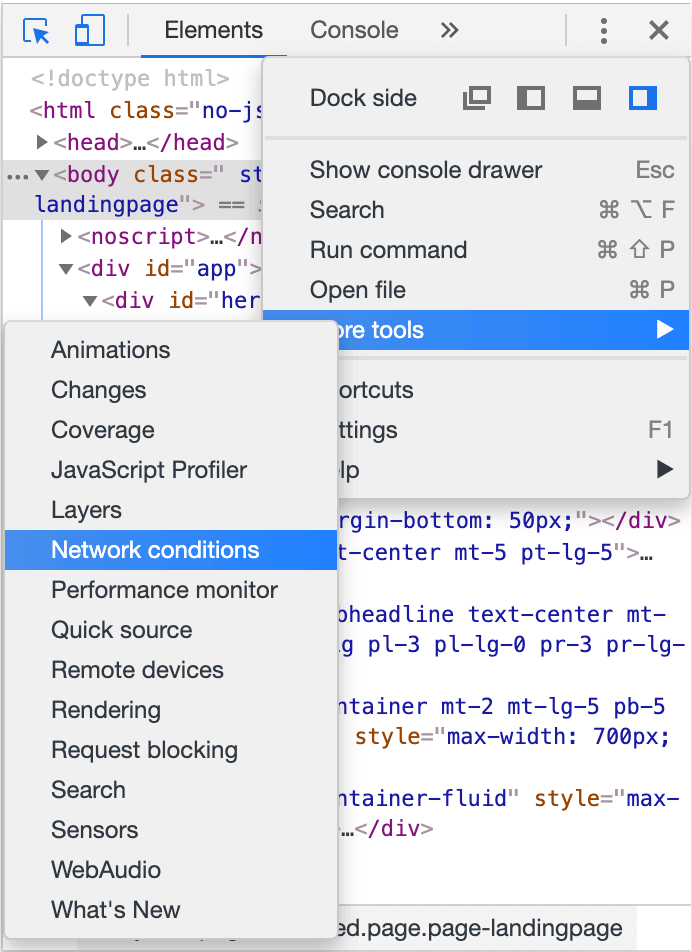 Haz clic en el menú de configuración representado por los tres puntos 1. Luego, haz clic en «More tools» 2 y a continuación, en «Network conditions»3.