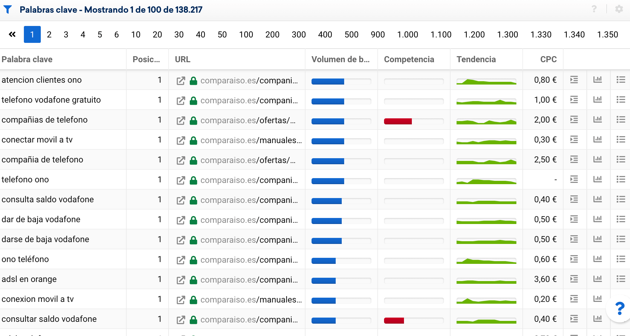 Accede a los datos de cualquier dominio usando nuestro buscador. Después puedes hacer el análisis que desees utilizando el menú vertical izquierdo. Aquí puedes ver, por ejemplo, con qué palabras clave posiciona el dominio comparaiso.es en Google:
