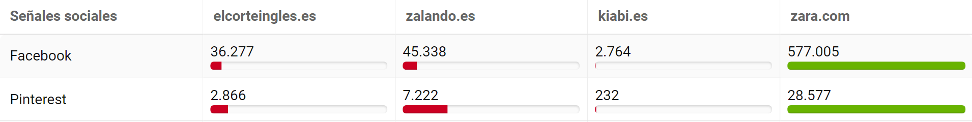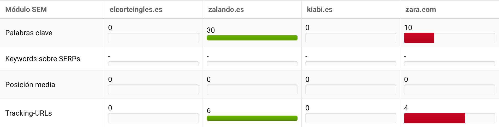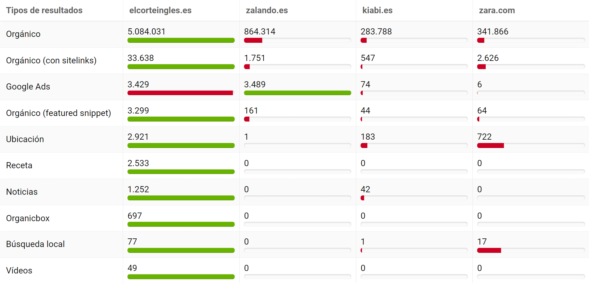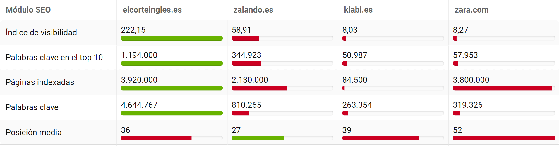 A simple vista se puede ver que el dominio «elcorteingles.es» domina en muchos valores. El dominio «desigual.com», en cambio, suele tener los valores más bajos. Además, «elcorteingles.es» tiene el índice de visibilidad más alto con 366,22 puntos, seguido de «zalando.es» y «kiabi.es», respectivamente.