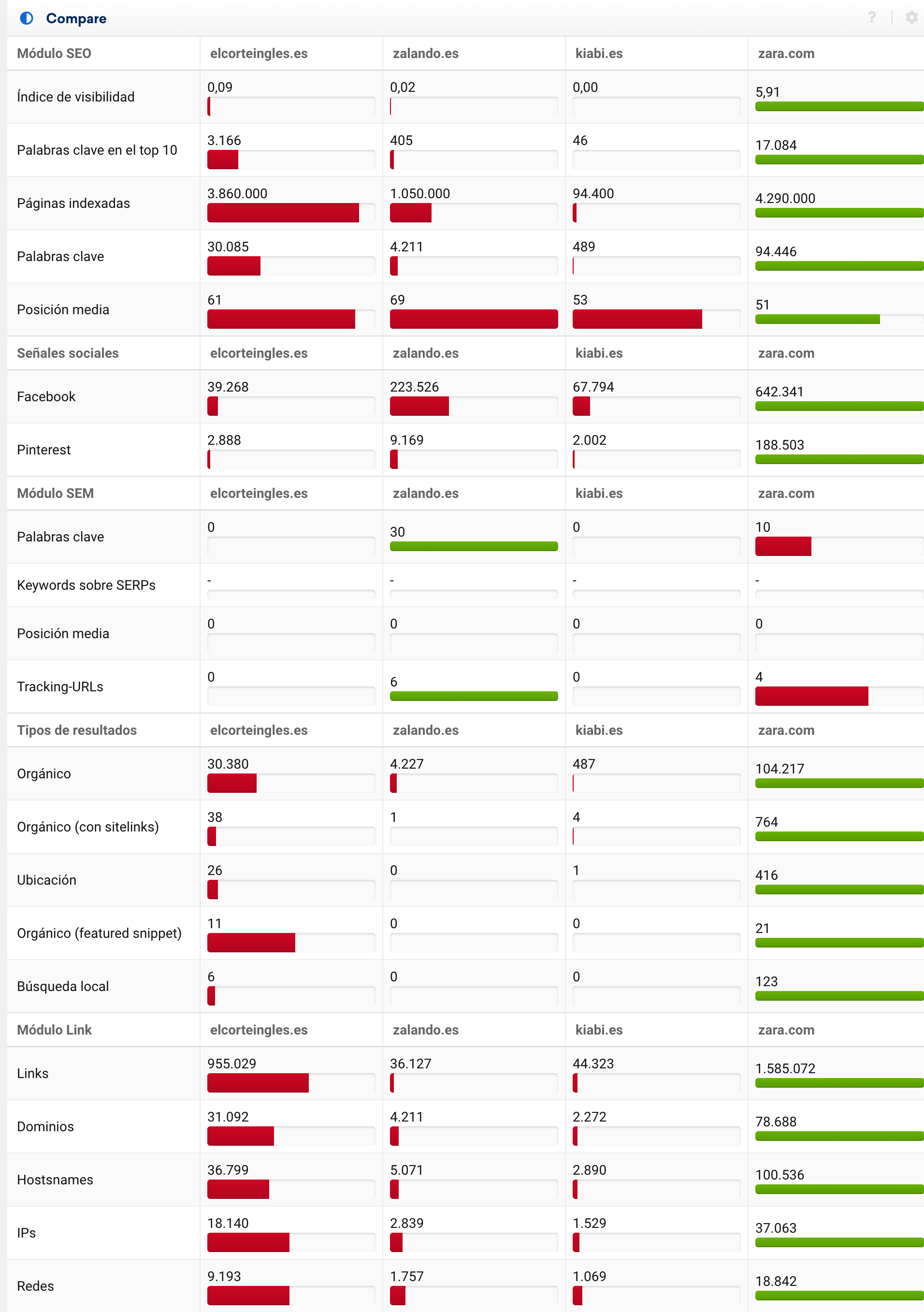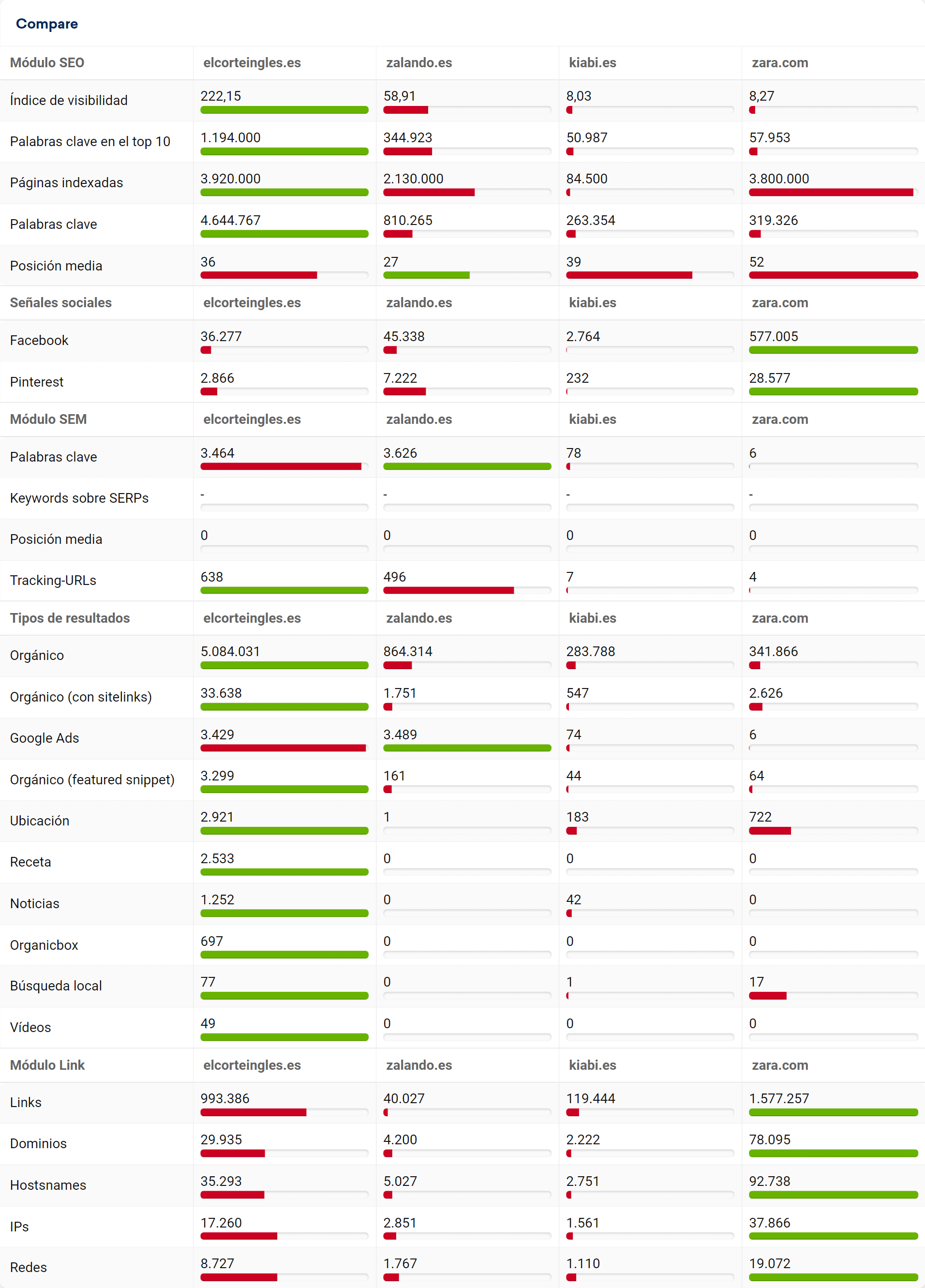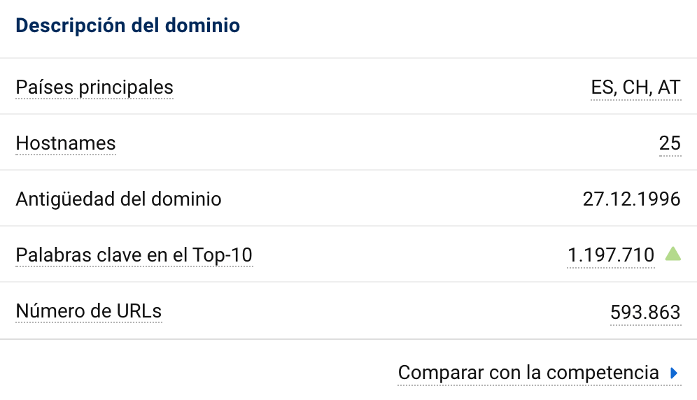 Como puedes ver, aquí encuentras un resumen de los datos más importantes de los dominios. Los datos del dominio mejor posicionado están marcados en verde. Los valores del dominio más débil para esos datos están marcados en rojo.