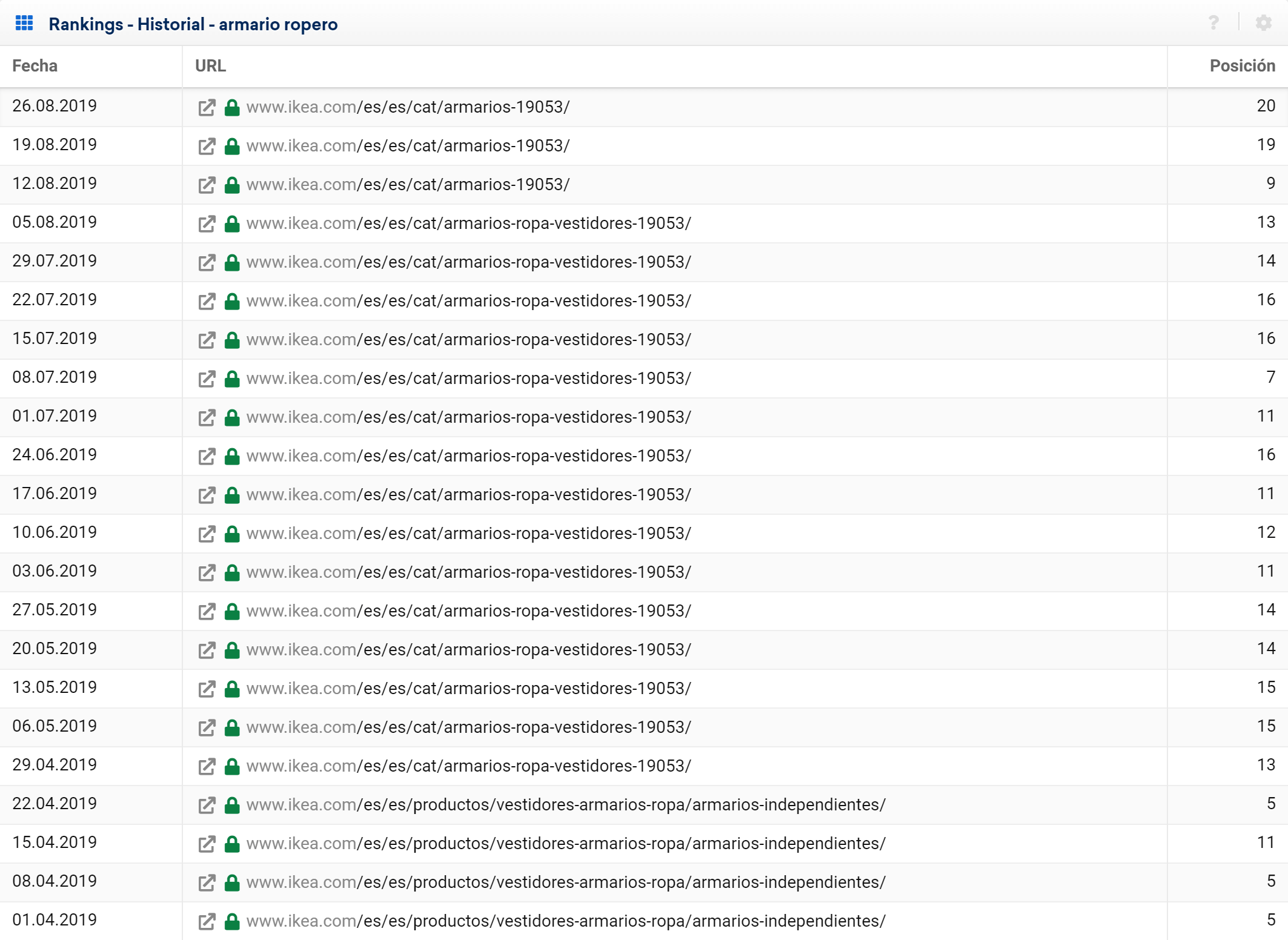 En la tabla con las URL clasificadas, se puede ver rápidamente que las URLs cambian casi cada semana y ocupan posiciones completamente diferentes.