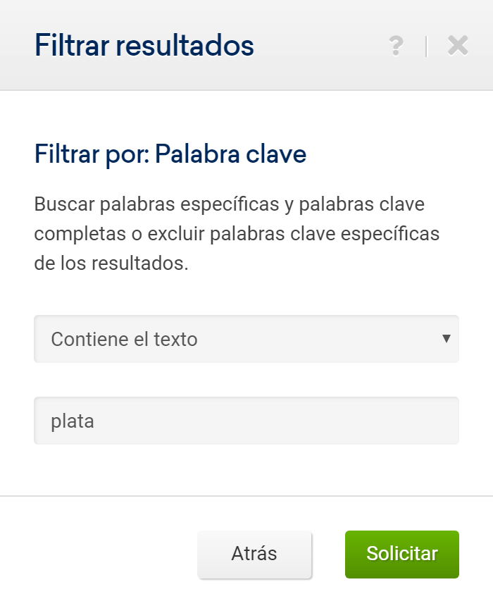 Con la ayuda de la función de filtro, los resultados también se pueden limitar a determinadas características de palabras clave o URL. Por ejemplo, sólo pueden mostrarse las palabras clave que contengan la palabra «plata» en la consulta de búsqueda.
