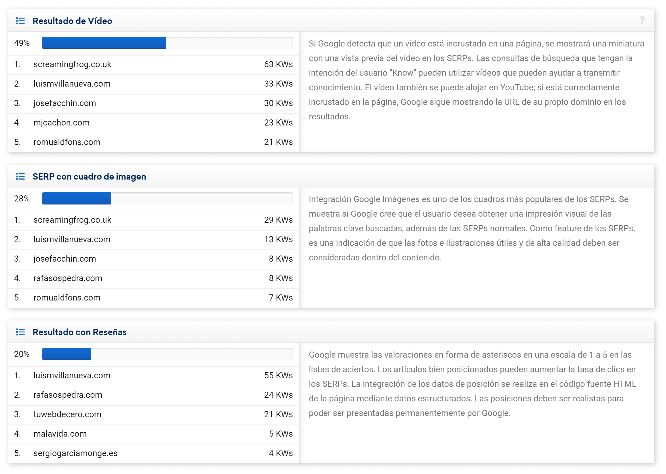 Por ejemplo, puedes ver qué características de las SERP se muestran a menudo junto a los resultados orgánicos. Hay que tenerlas en cuenta a la hora de crear los puestos.