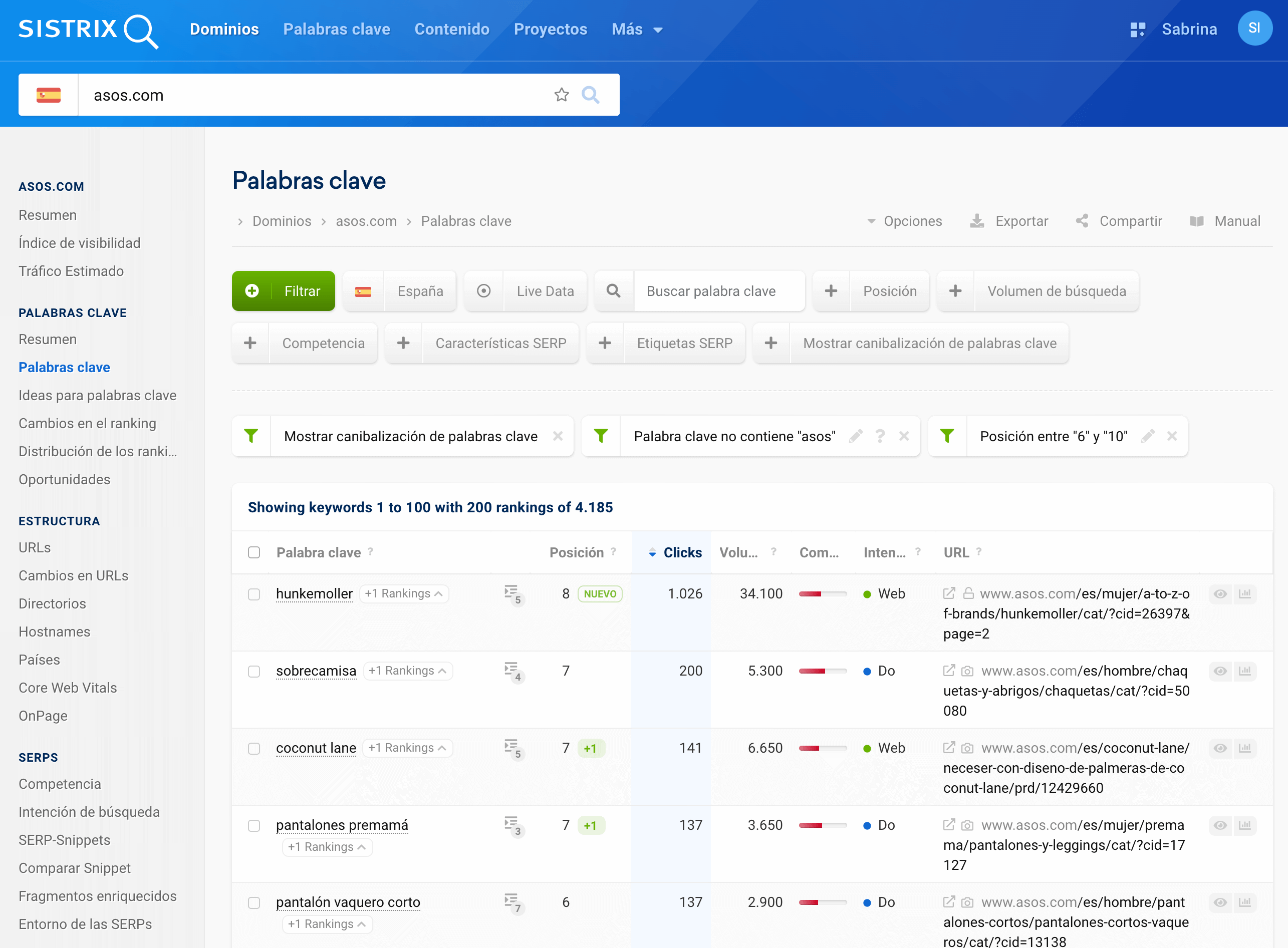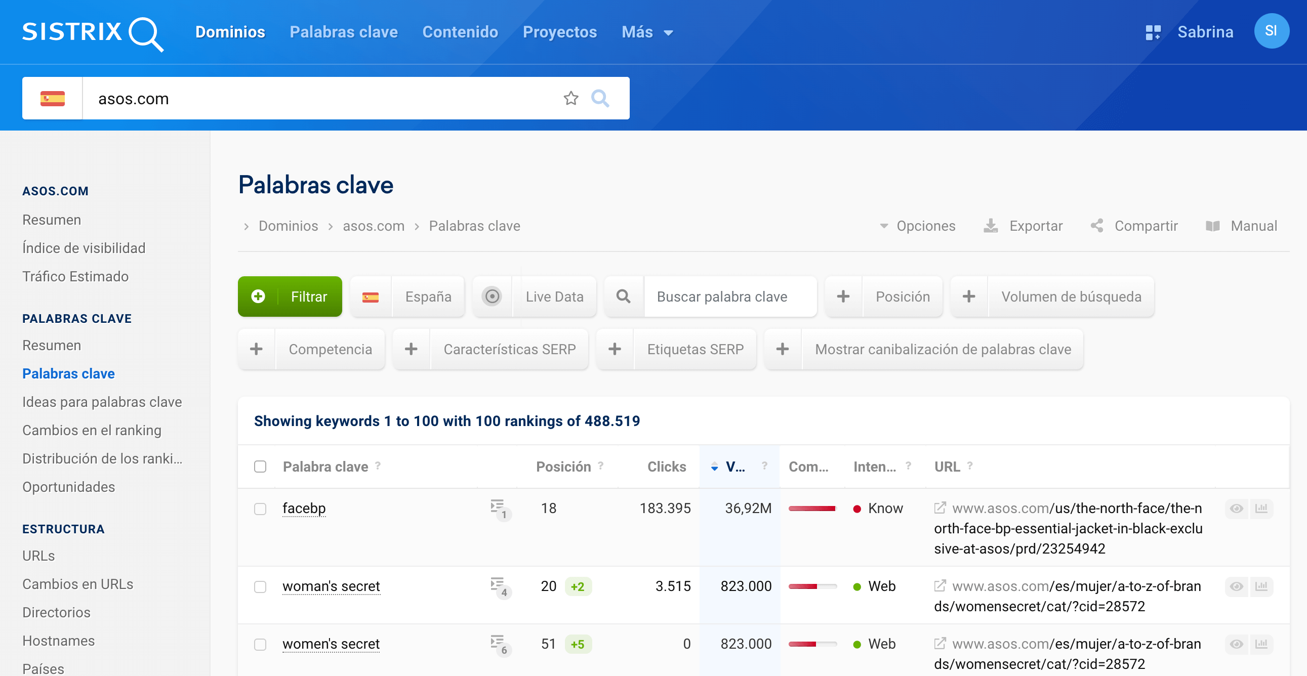 Empezamos introduciendo el dominio asos.com en la barra de búsqueda de SISTRIX.