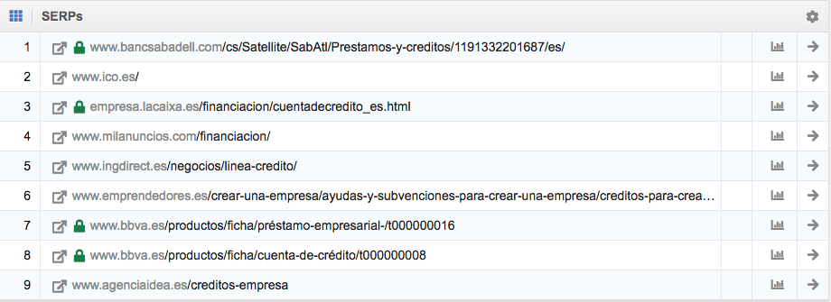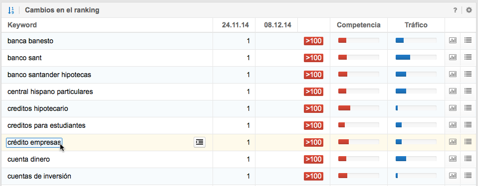 Puedes encontrar la evolución del posicionamiento de una determinada palabra clave para el dominio analizado, haciendo clic sobre el símbolo del gráfico 1 que aparece en el extremo derecho de la tabla.