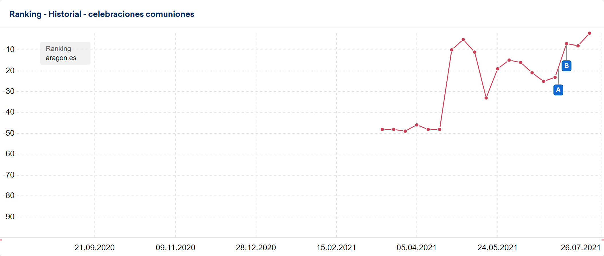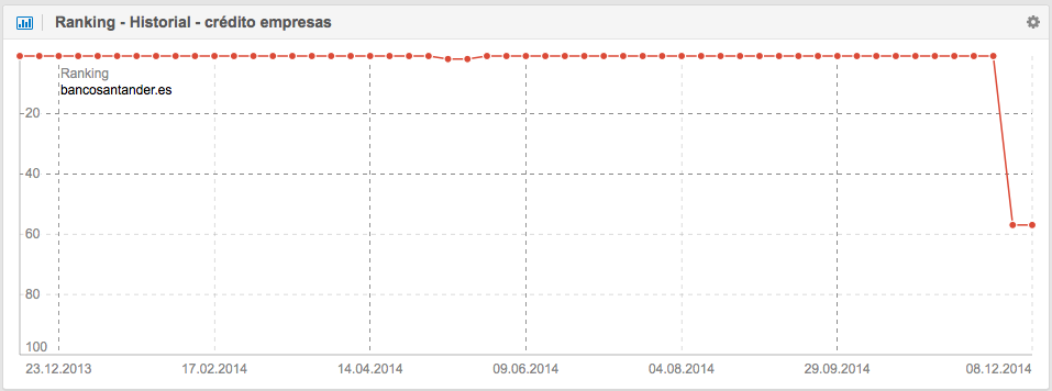 Aquí vuelve a quedar claro el cambio de posición del dominio para la palabra clave en esa semana concreta. El hecho de que el gráfico desaparezca significa que a partir de ese momento no hubo posicionamiento de esa palabra clave en los 100 primeros resultados de búsqueda de Google.
