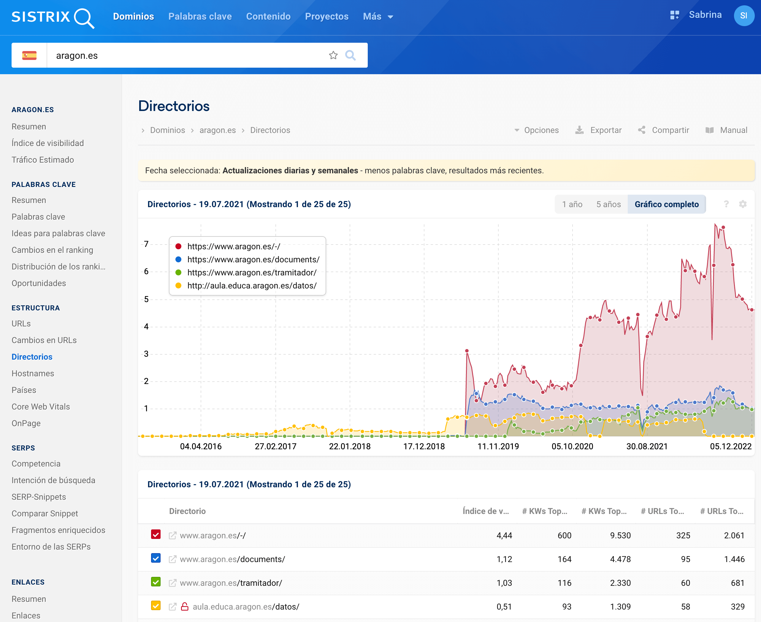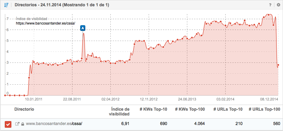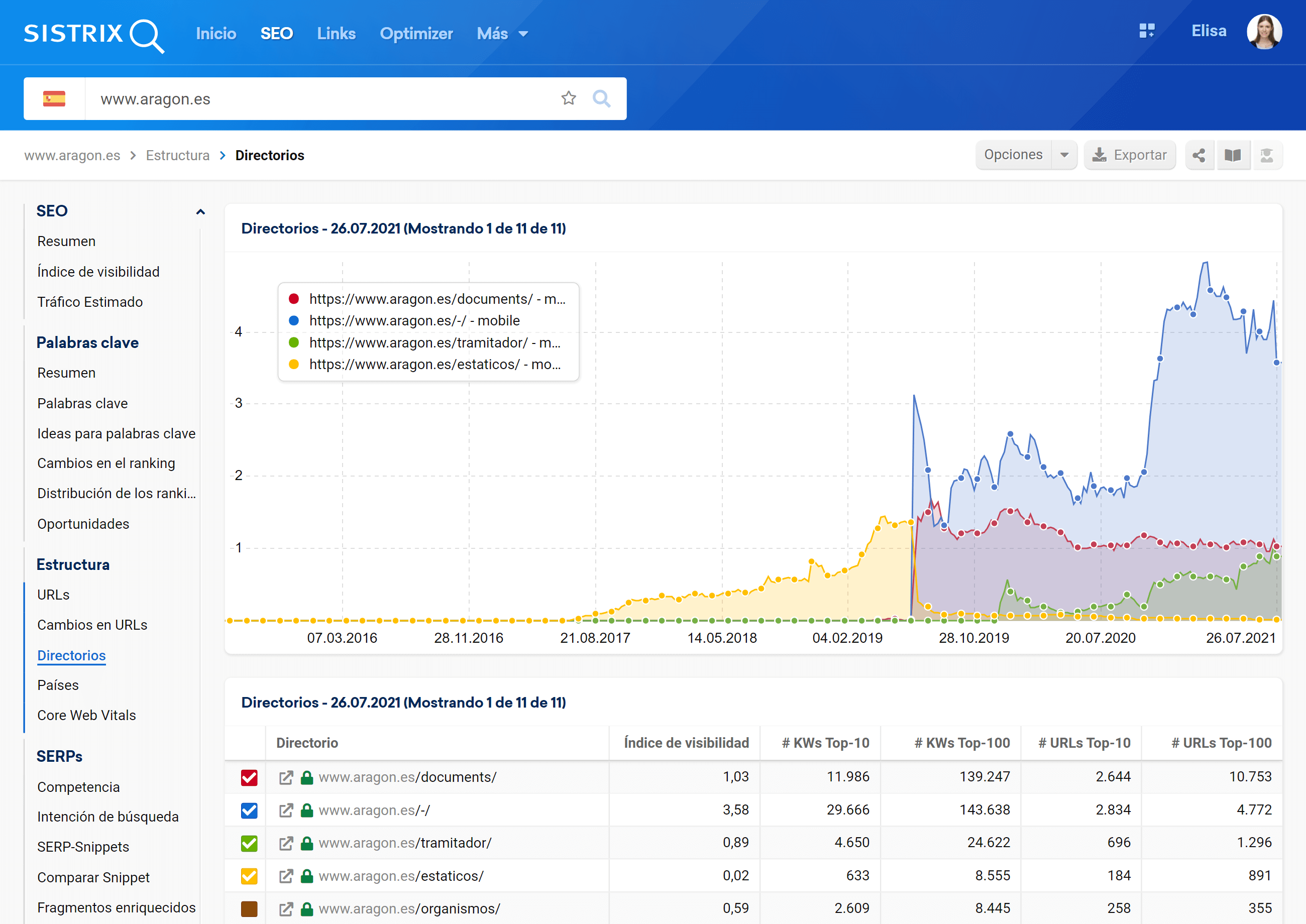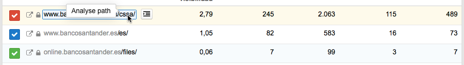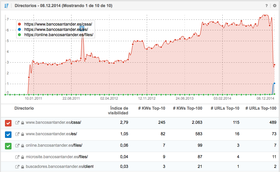 Con este análisis puedes ver si la pérdida de visibilidad de tu dominio se debe a uno o varios directorios. A menudo, uno de los tres directorios que genera la mayor parte de la visibilidad de un dominio puede identificarse como causa potencial de la caída de visibilidad.