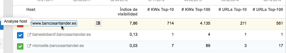 Este gráfico compara siempre los cuatro subdominios que más contribuyen a la visibilidad del dominio. Haciendo clic en el icono ✓, clasificado por colores, en el recuadro con datos en 2 (imagen de arriba) se pueden mostrar y ocultar las tendencias del Índice de Visibilidad de los distintos subdominios, así como también examinar otros subdominios que no pertenecen a los subdominios principales.