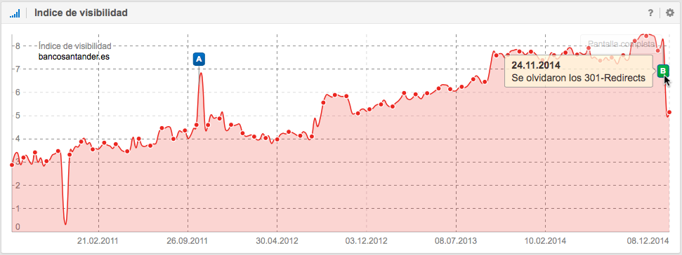 La pérdida de visibilidad del dominio se debe a un nuevo diseño de URL que afecta a muchas palabras clave importantes y bien posicionadas. La inexistencia de redirecciones 301 de la antigua estructura de URL a la nueva, ha provocado que Google elimine de los resultados de búsqueda los contenidos que ya no se pueden encontrar.