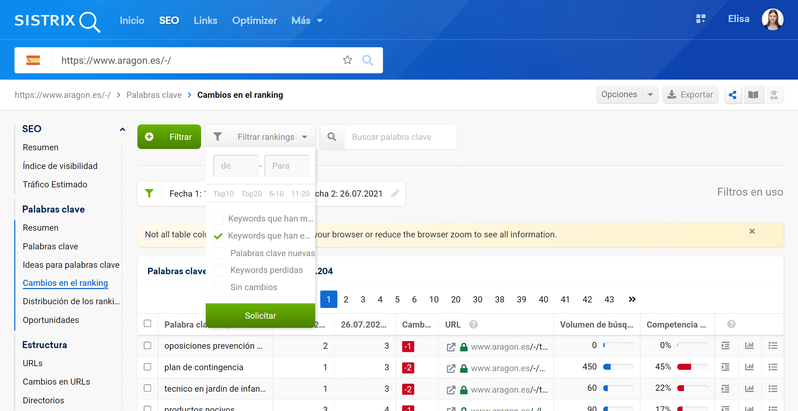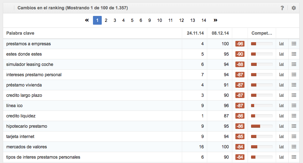 La tabla muestra las posiciones que ocupaban las palabras clave en los primeros puestos en la fecha en que se inicia la baja de la visibilidad y las compara con las posiciones de esas palabras clave en la fecha final seleccionada.