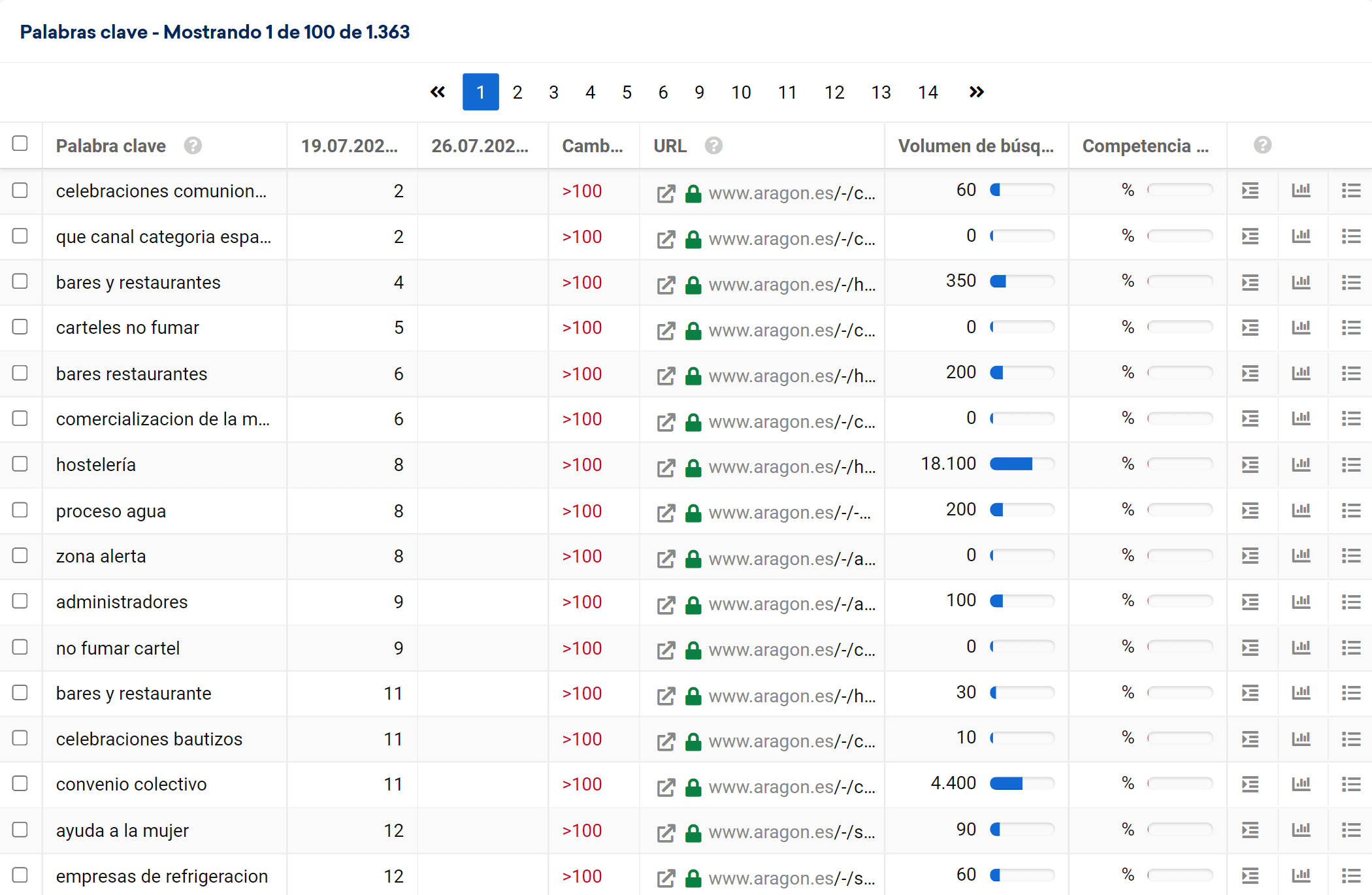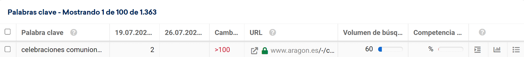 En la tabla situada debajo del gráfico, puedes ver qué URL estuvo posicionada en cada momento. El día 19 de julio de 2021 la URL posicionada era «https://www.aragon.es/convocatoria/bomberos/aragon», en nuestro ejemplo.