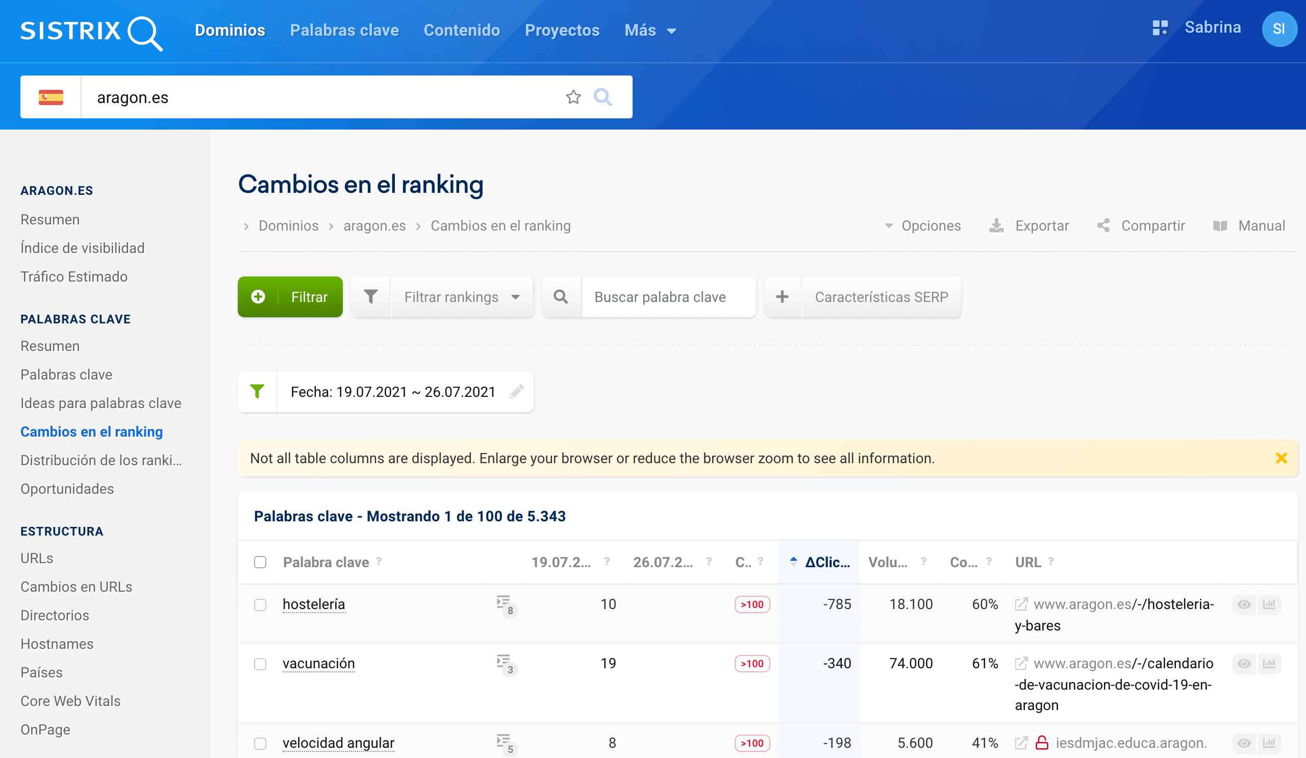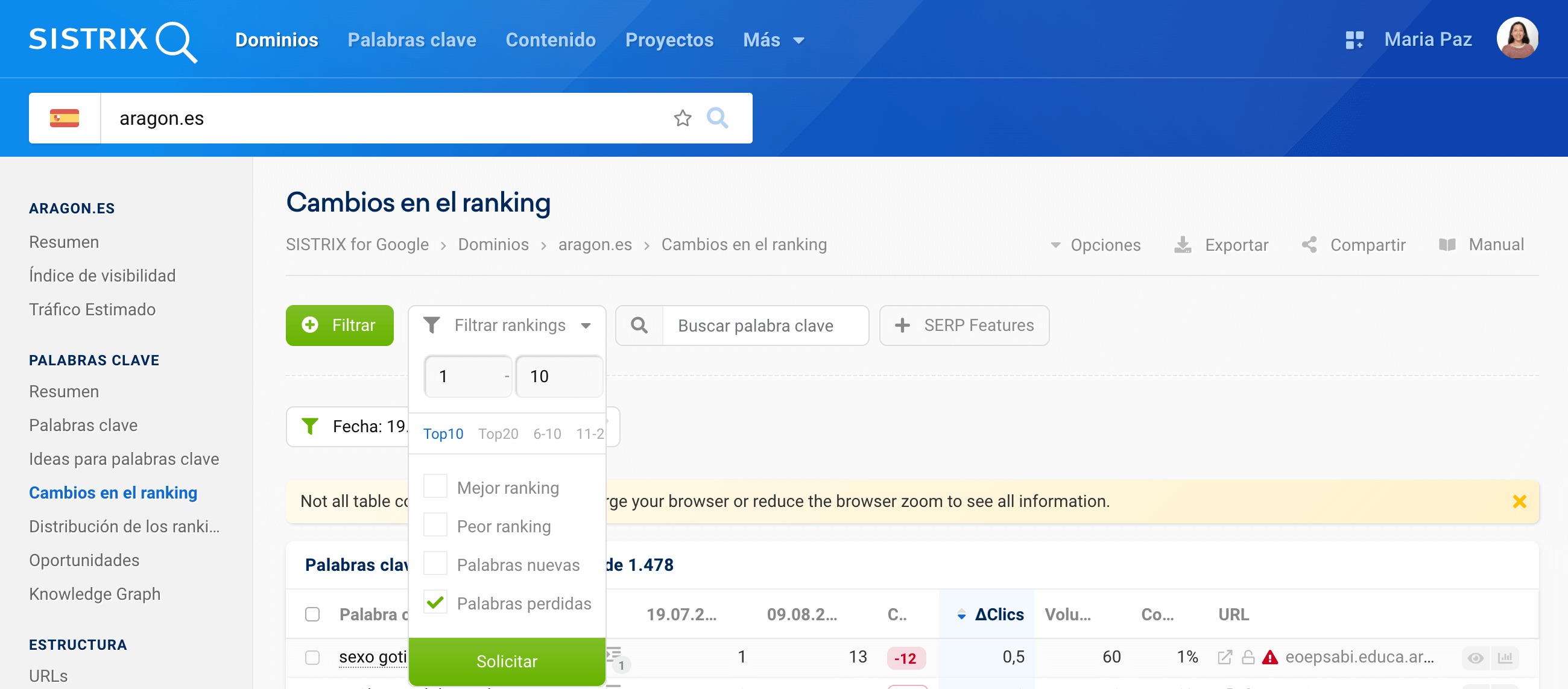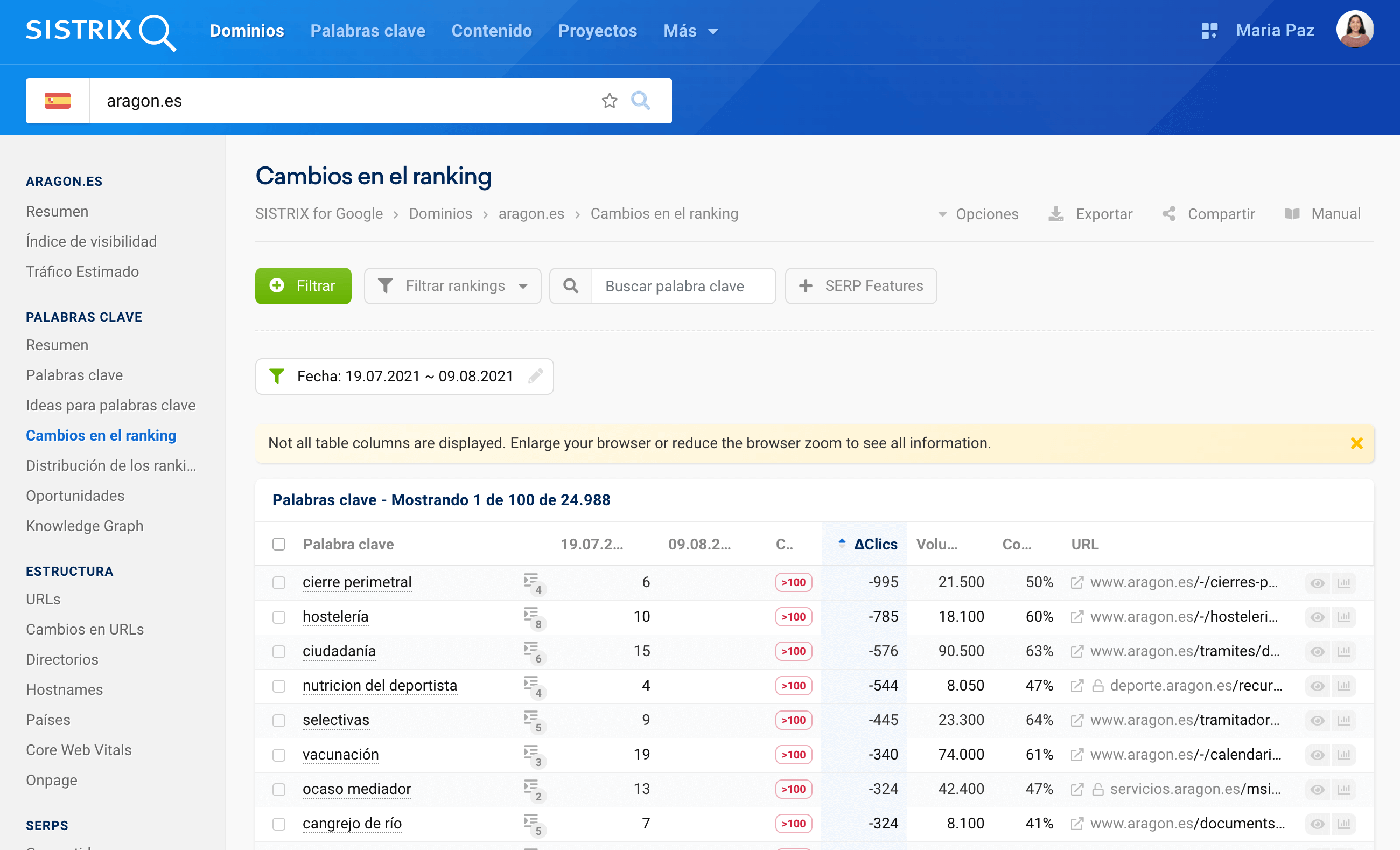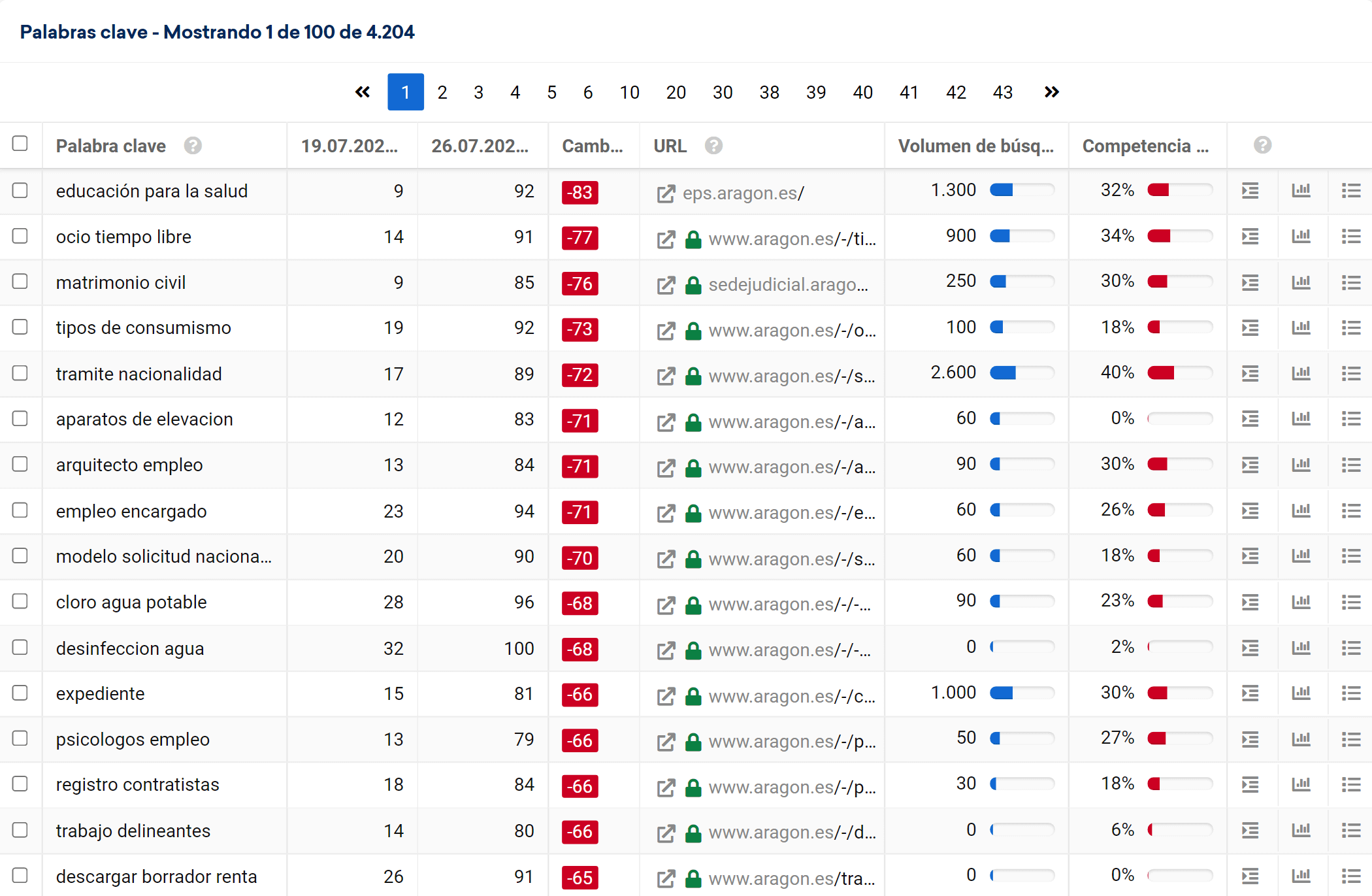 En el caso del dominio «aragon.es», hemos podido determinar que muchas de las primeras posiciones del ranking para palabras clave importantes han empeorado drásticamente. En algunos casos, las posiciones han bajado más de 90 posiciones, es decir, de la primera página de los resultados de Google a la décima. Otras palabras clave importantes han caído completamente fuera de los 100 primeros resultados de búsqueda de Google.