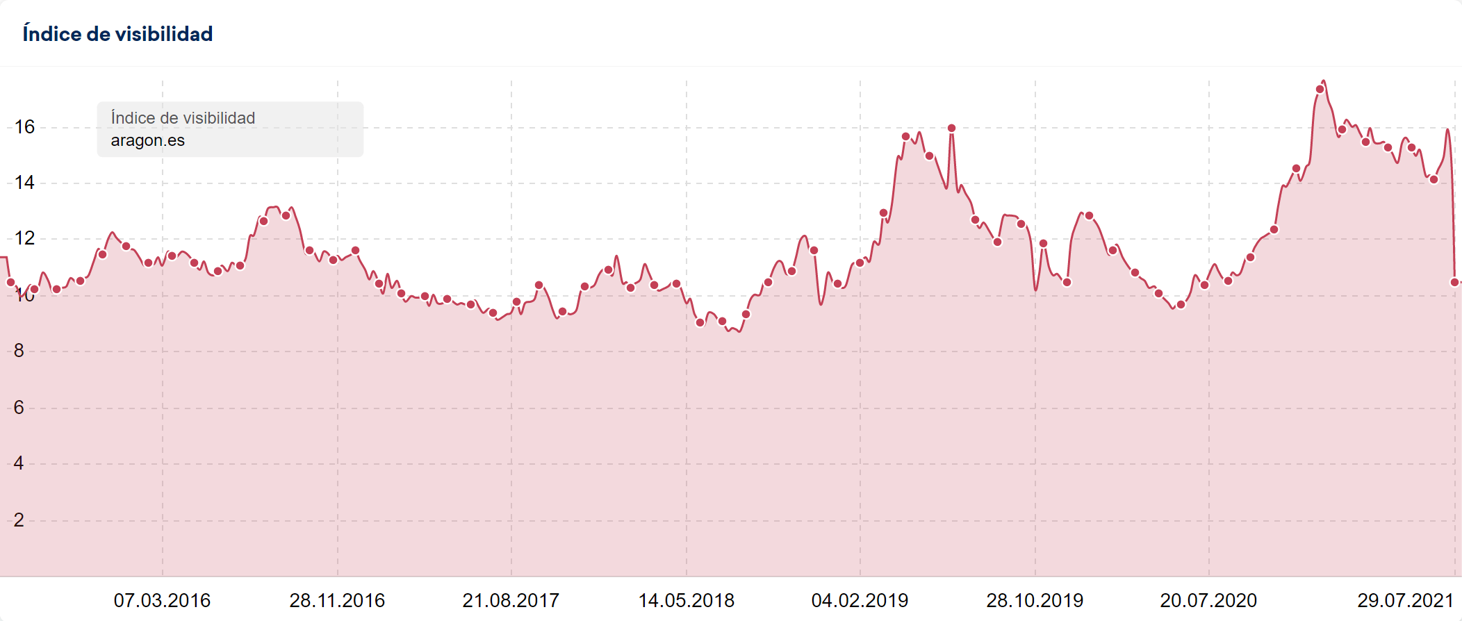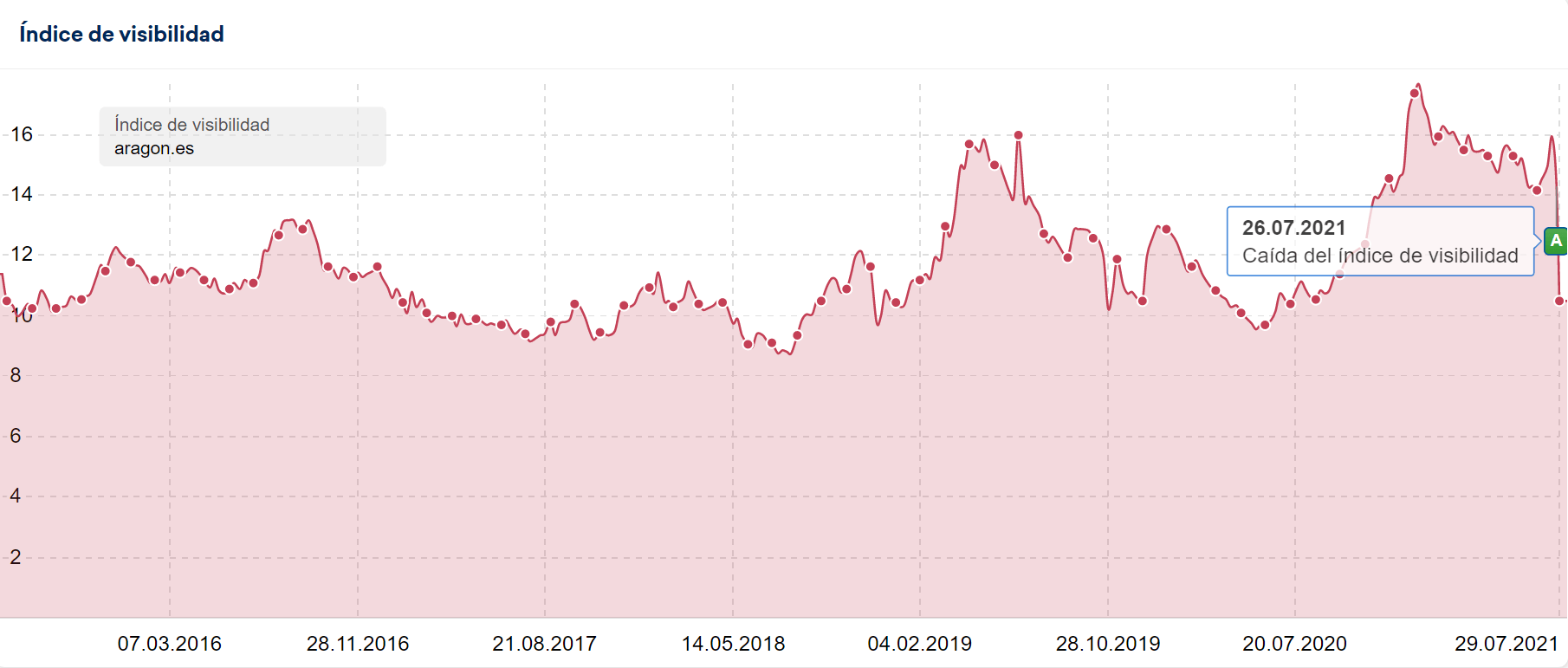 La visibilidad del dominio «aragon.es» cayó casi un 68% desde el día 19 de julio de 2021 hasta el día 09 de agosto de 2021.