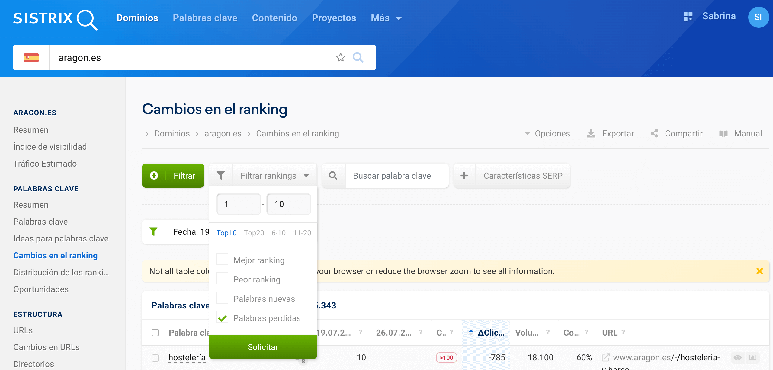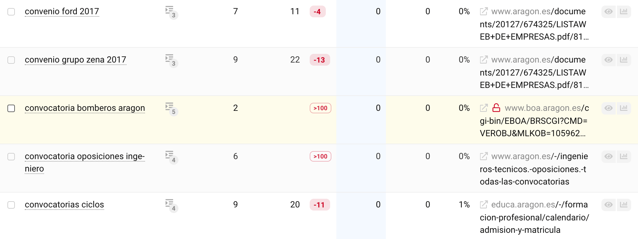 Para comprobar si esto también se aplica al dominio «aragon.es», analizamos las palabras clave perdidas con respecto a su historial de posicionamiento. Aquí utilizamos como ejemplo la palabra clave «convocatoria bomberos aragon».