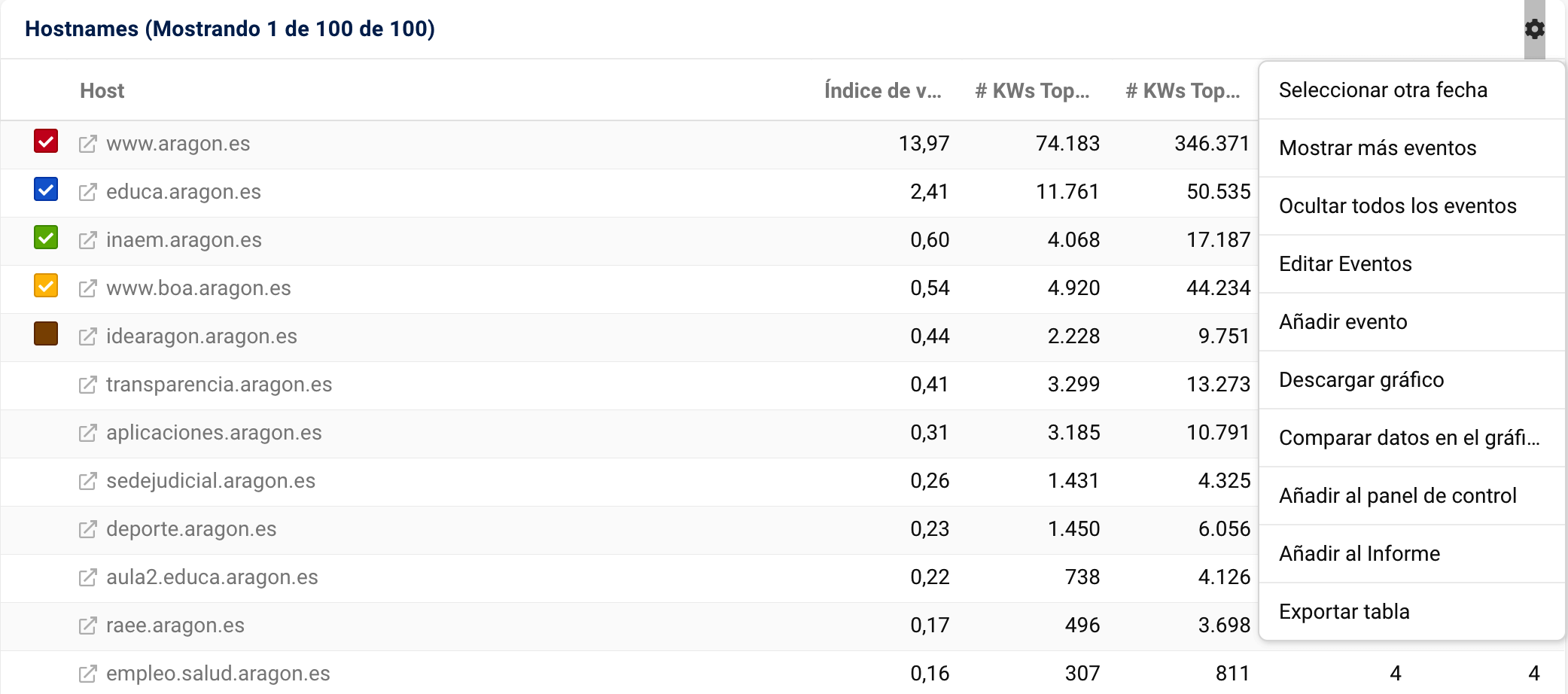Se observa claramente que la pérdida de visibilidad del dominio se debe al subdominio «www.aragon.es» 3. Con unos 8 puntos de visibilidad, es el subdominio con mayor visibilidad.