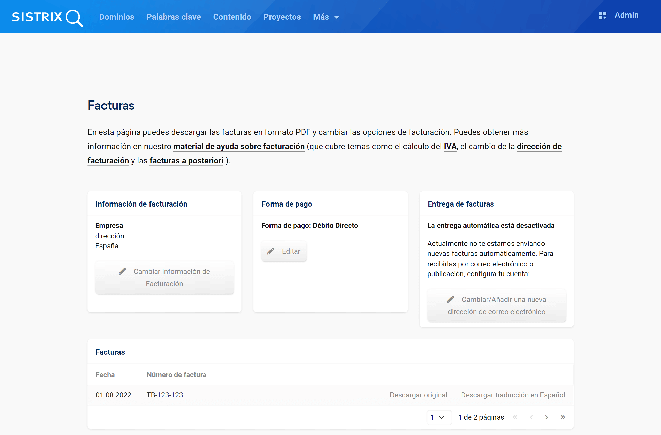 En la sección «Facturas» puedes introducir y/o editar los detalles de facturación de tus futuras facturas.